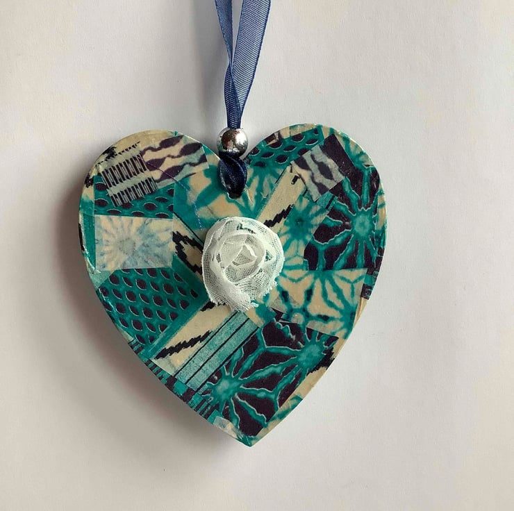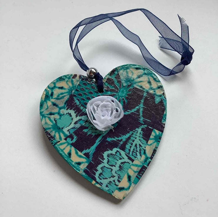 Both sides of this wooden heart have been decopatched in a mix of blues and varnished.
