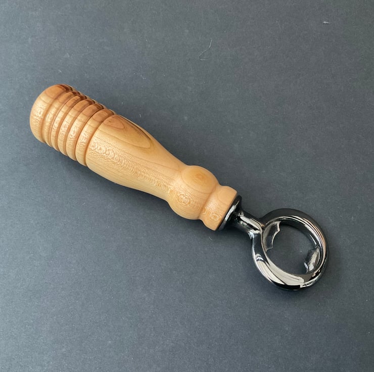 Hand turned bottle opener made from locally sourced and home seasoned plum wood with a beautiful grain and reddish colour and a chrome metal insert. It is finished with melamine lacquer for a hard wearing surface. When dirty wipe with a damp cloth and dry. Not advisable to soak in water as could damage the surface. Will last for many years if treated this way.
