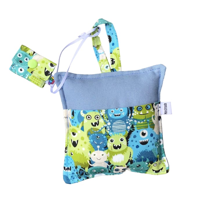 Tooth Monster fabrics used on this cushion for the hanging tab, mini tooth purse and for the large pocket on the reverse.