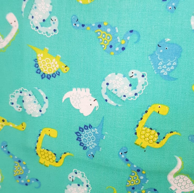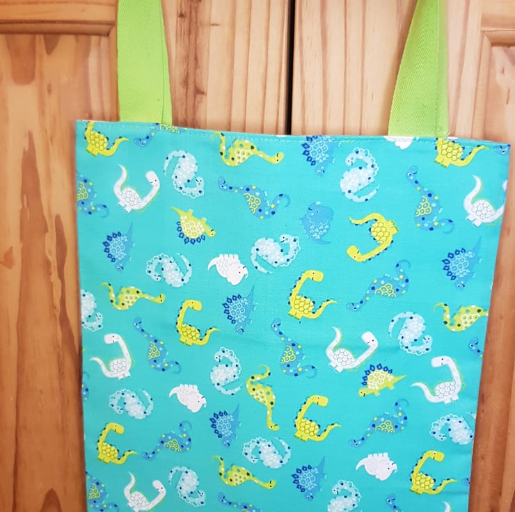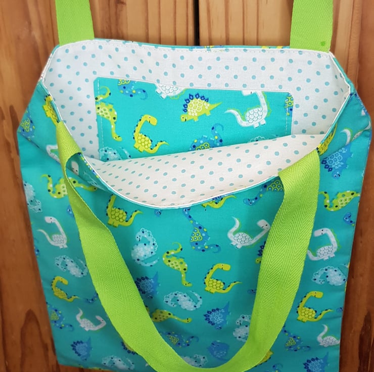 This little child's tote bag would please a dinosaur lover. Made from cotton with an inside pocket it is fully lined with cotton polka dot cotton fabric and is ideal for popping in a gift or dino treasures