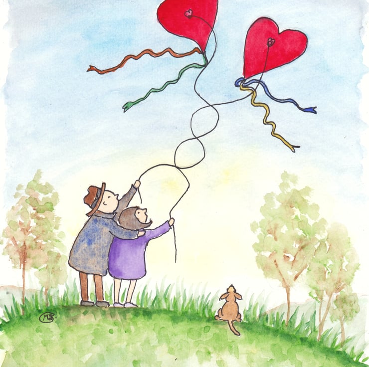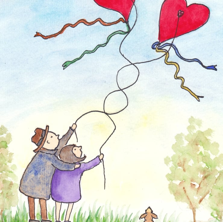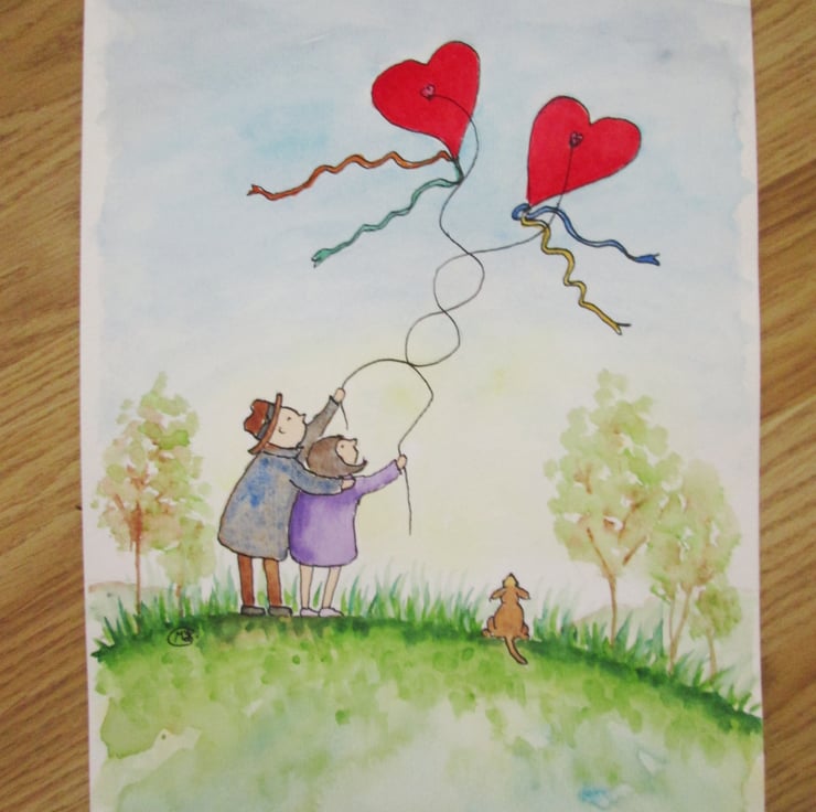 Couple flying their heart shaped red kites together. Oh, my the hearts are entangled!