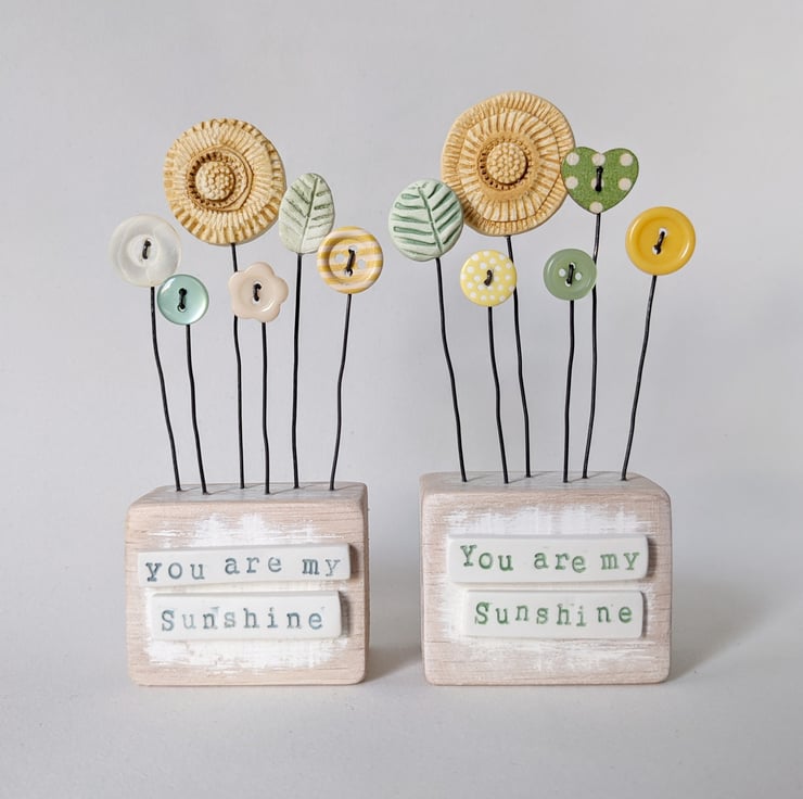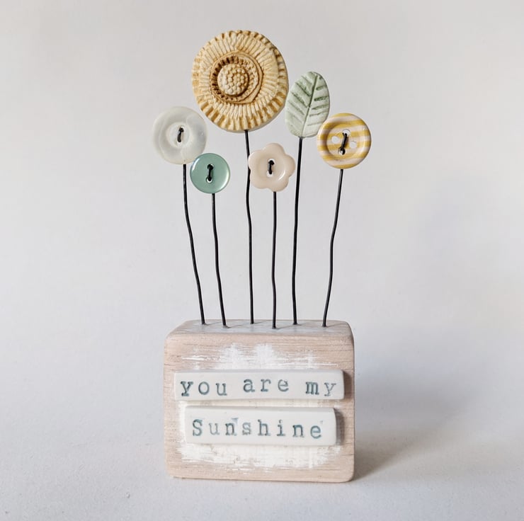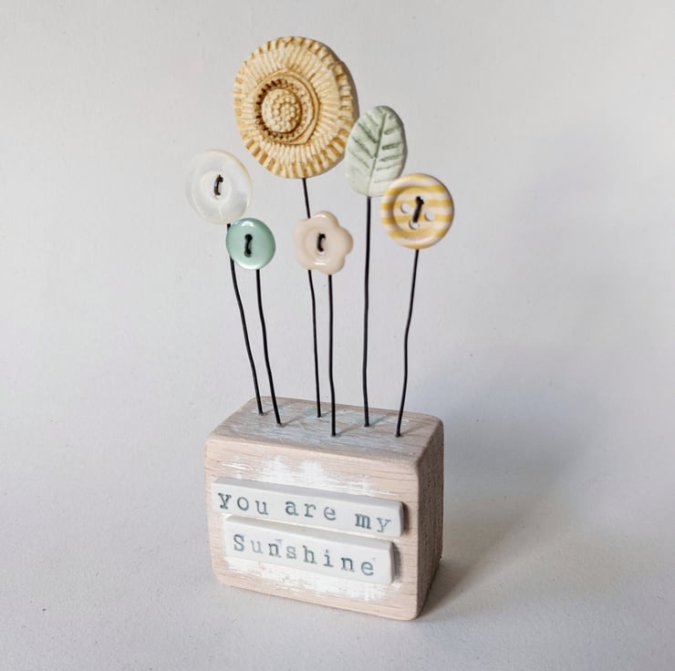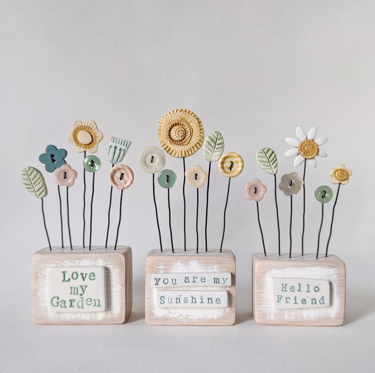 Clay and button flowers grow in this little garden. They stand on their wire stalks in a painted wooden block with little words on the front.