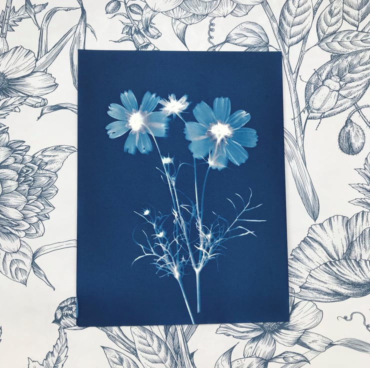 Botanical Art, Cyanotype of Cosmos, October Birthday, pretty gift.