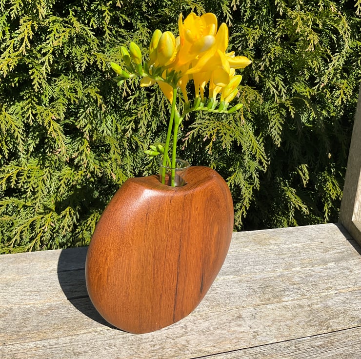 Inspiration came from adapting more traditional wall mounted test tube vase nto an attractive free standing bud vase, displaying soft curves in the natural colour and grain patterns of wood.
