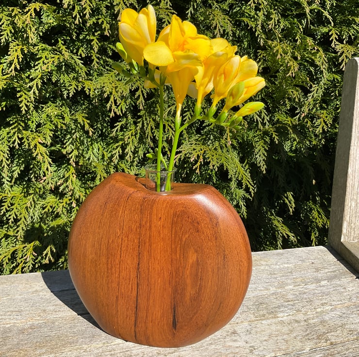 A stylish bud vase made from wild mango wood in a attractive and stylish sperical shape which holds a borosilicate glass tube. The sides have been gently curved and sanded to provide a very smooth tactile surface. The vase is finished in durable light satin finish.