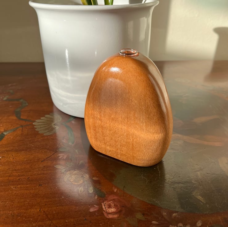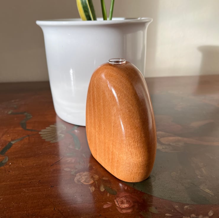 Inspiration came from adapting more traditional wall mounted test tube vase nto an attractive free standing bud vase, displaying soft curves in the natural colour and grain patterns of wood.
