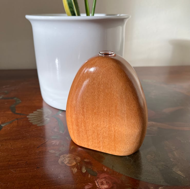 A stylish bud vase made from beech wood in a attractive and stylish pattern which holds a glass tube. The surfaces are rounded and sanded to provide a smooth, tactile surface. The vase is finished in durable oil to a light satin finish. The vase overall dimensions being 105mm x 115mm x 44mm thick. The tube vase 100mm high x 16mm diameter.