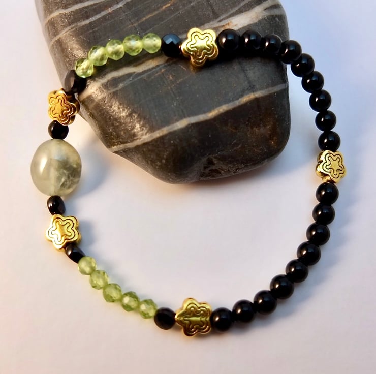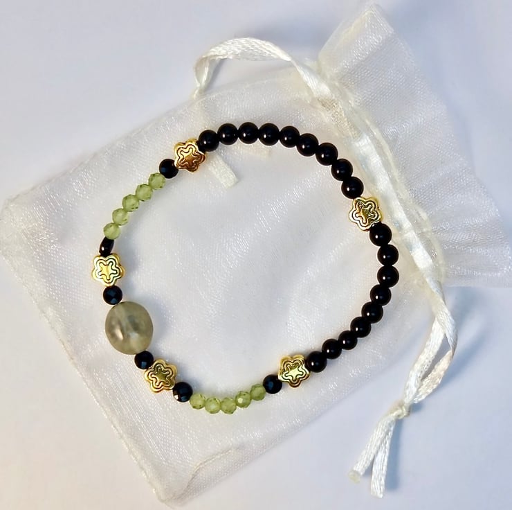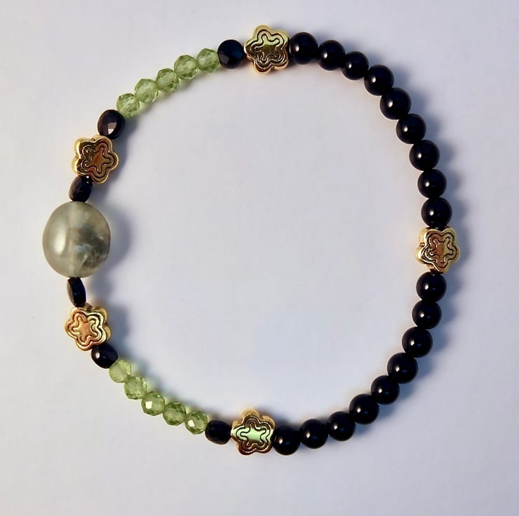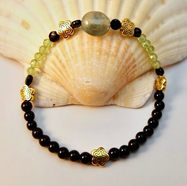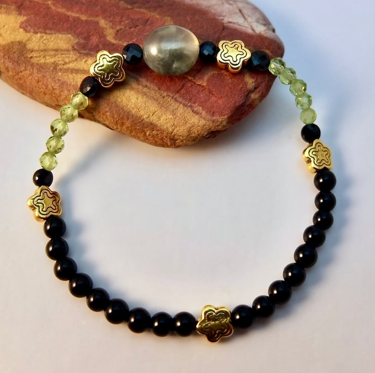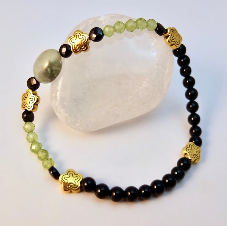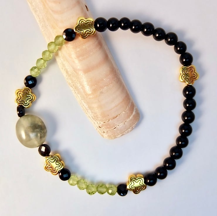 Sparkly green and black stretch bracelet with beautifully faceted AAA grade Peridot and Black Spinel beads.