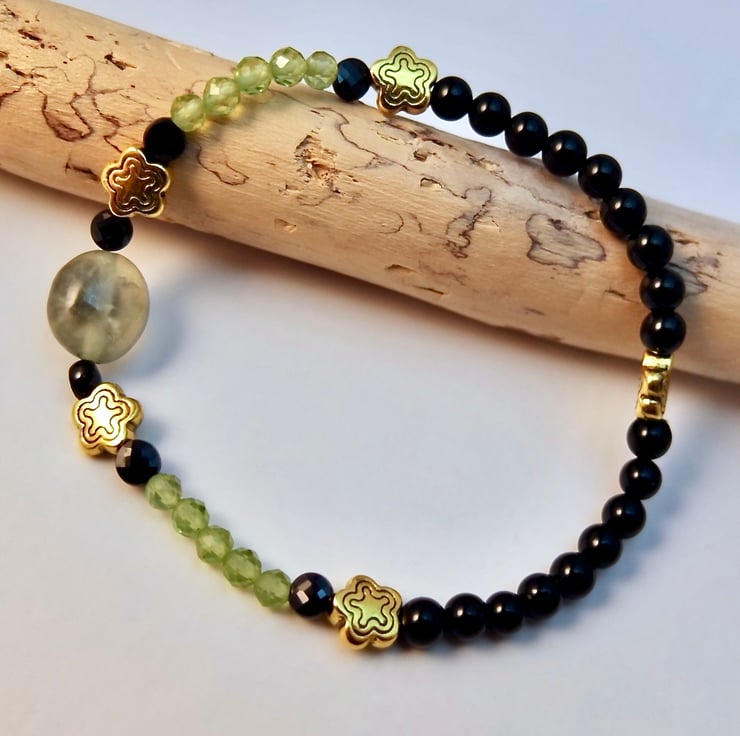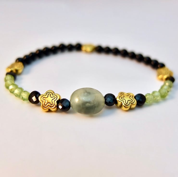 On either side of a 10mm Prehnite nugget, I have threaded two 4mm faceted AAA grade Black Spinel coins that bracketed a 7mm gold Tibetan star, five 3.5mm micro-faceted AAA grade Peridot beads, and another Black Spinel coin.