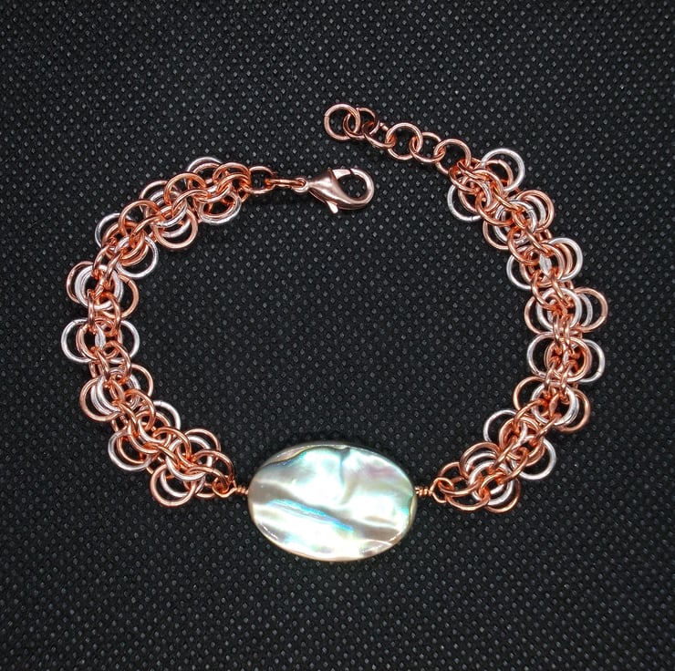 This 7 inch watch style bracelet features a stunning abalone oval at the centre of a "back to work" chainmaille bracelet in rose gold plated copper and silver plated copper.