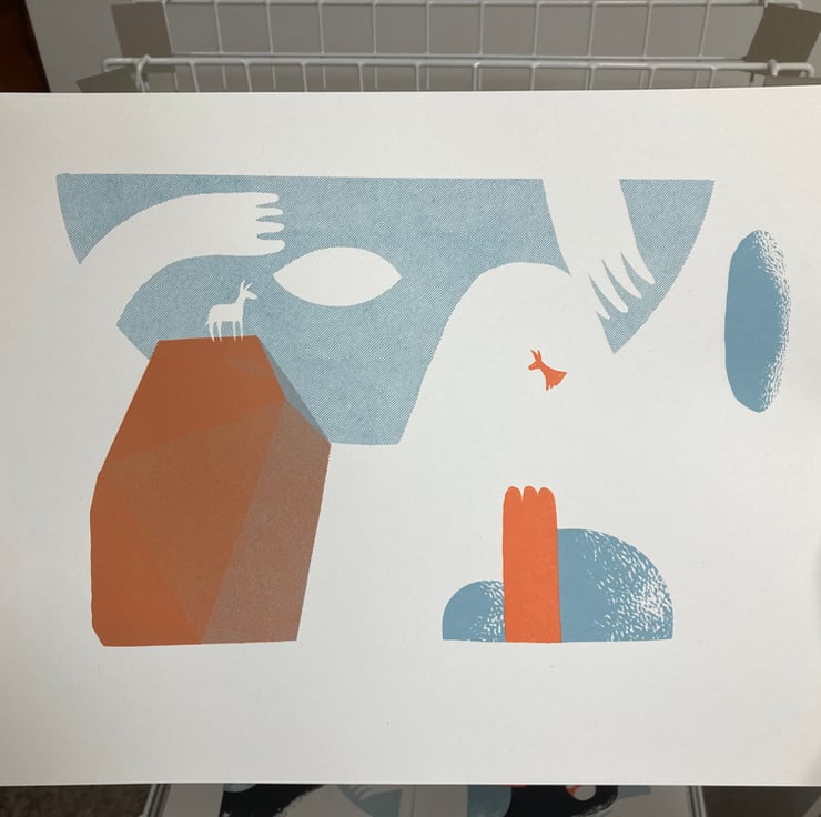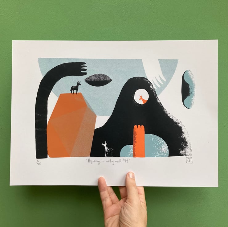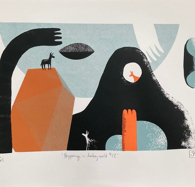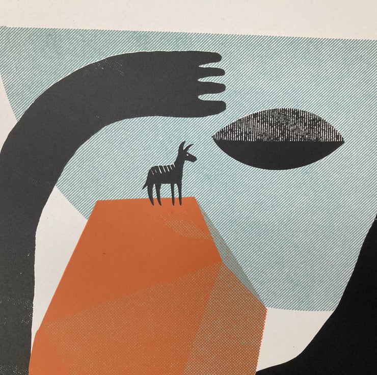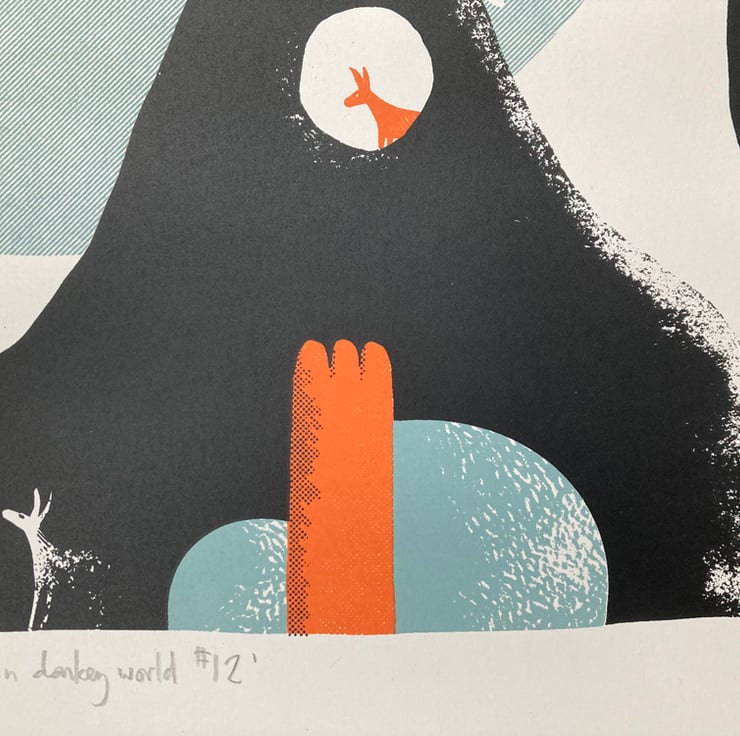 This is the twelfth print in the donkey-world series, a continuation of my donkey theme. Like all of my donkey adventure prints I decided to try and create a secret world that only donkeys know about, full of intriguing and slightly confusing features for them to explore (plus several helping hands!). In this print, things get a little mysterious and confusing with the landscape becoming less bound by gravity and with fewer earthly clues...