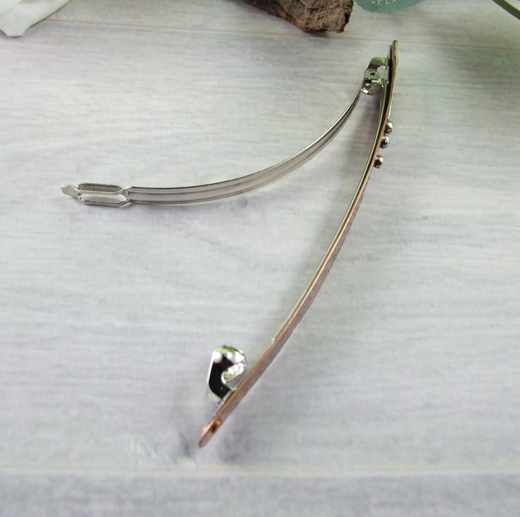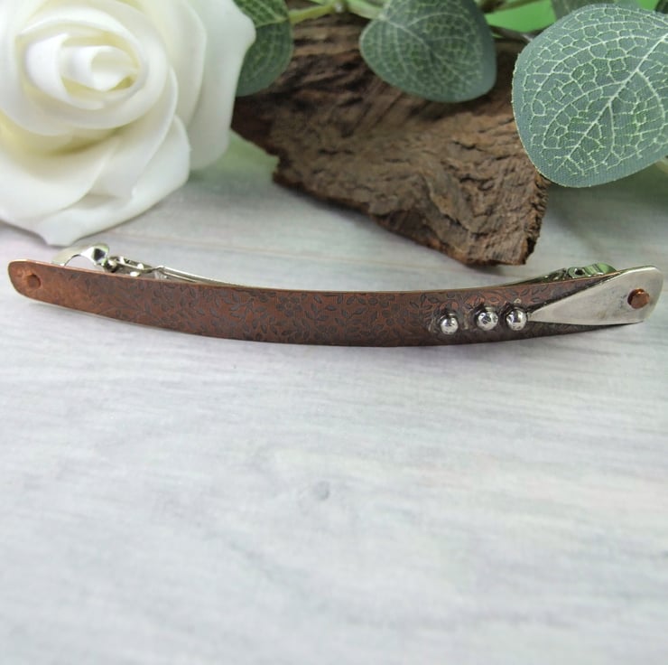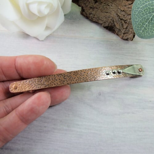 I have created the base for the barrette using .5mm copper sheet, cut by hand into a long rectangle shape with rounded ends, then textured with an embossed floral pattern. To this I have added geometric shapes in contrasting metal and then riveted this to a purpose bought steel spring clip.