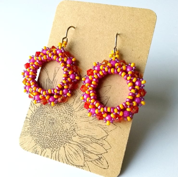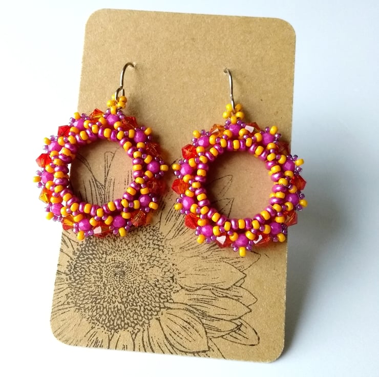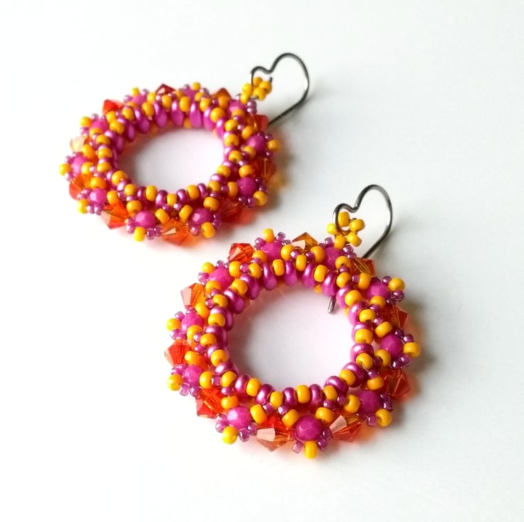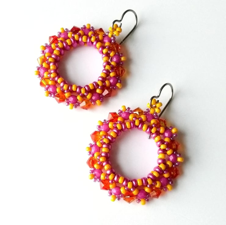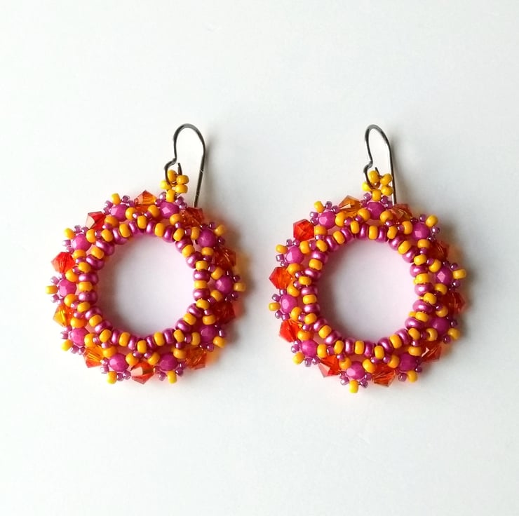 Twin-holed beads have been used to form a solid ring and then embellished with crystals and seed beads. This pair features sparkly Austrian 4 mm crystal bicones in fire opal orange - plus faceted 3 mm bright magenta pink-coloured glass beads, together with seed beads in orange and fuchsia pink.