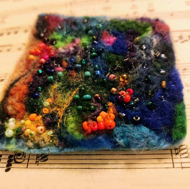Unique Needle Felted & Hand Embroidered Brooch with seed, bugle beads and embroidery stitch embellishments.