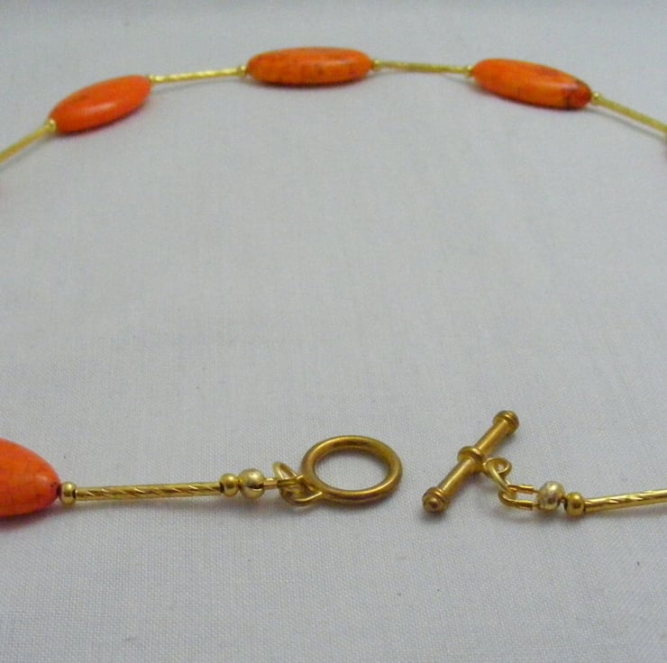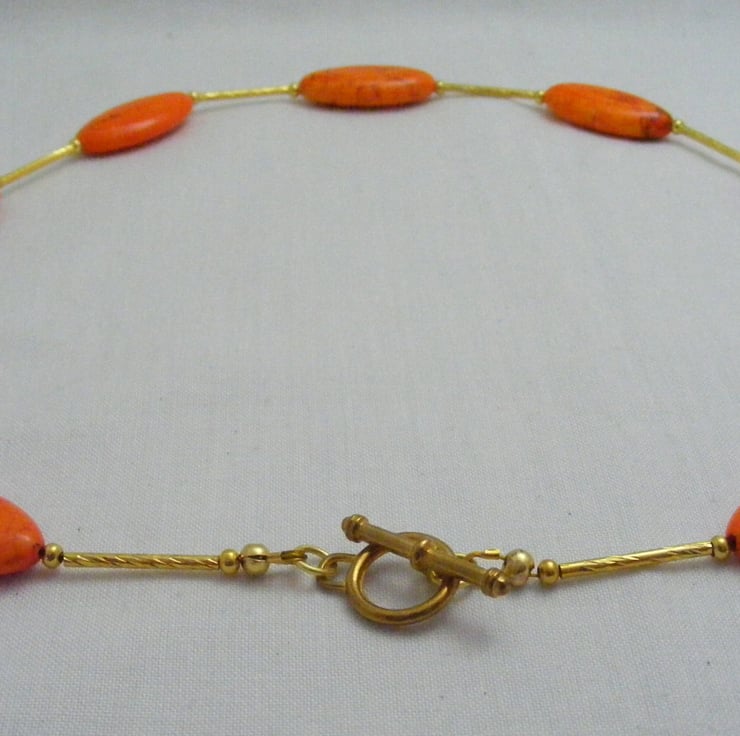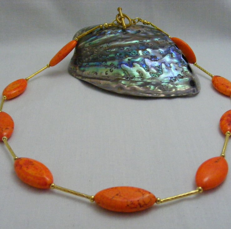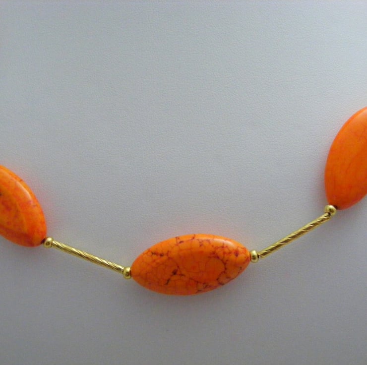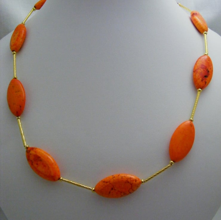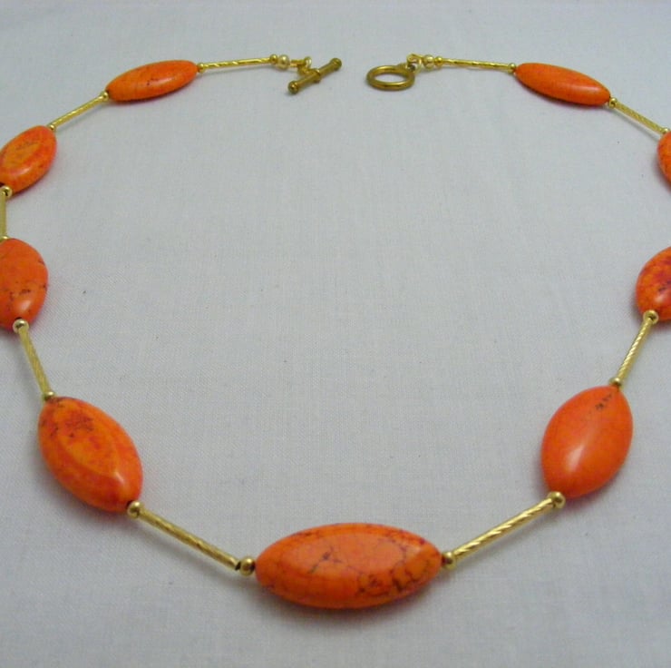 One of a kind, semi precious gemstone necklace, handmade with, 30x15mm orange magnesite ovals, 20x2mm gold plated tube spacers, 3mm gold plated spacers, gold plated findings and a round toggle clasp. This lovely necklace would compliment any outfit.