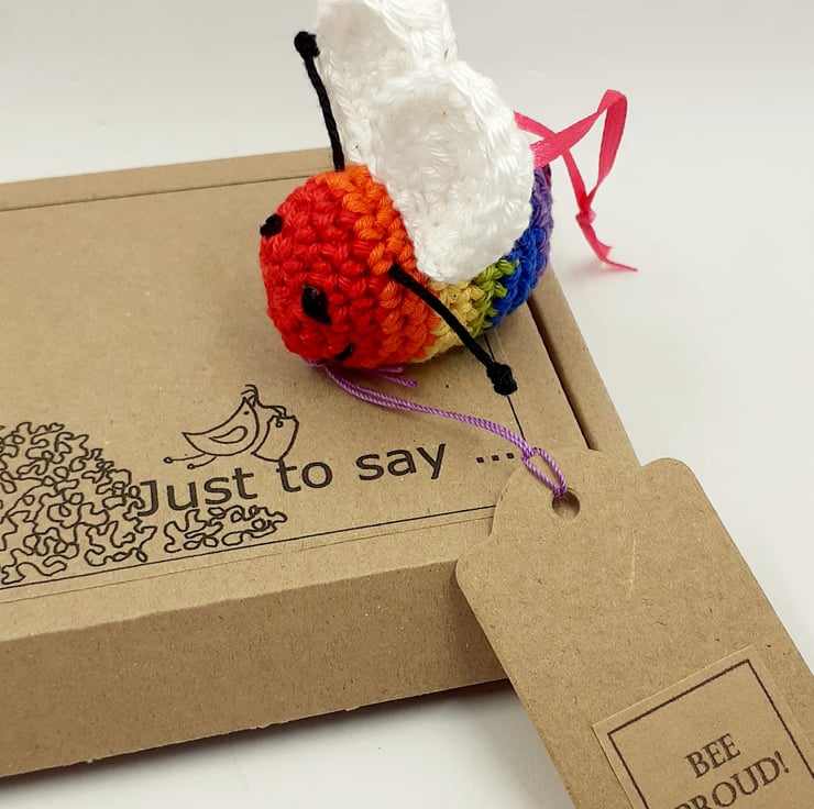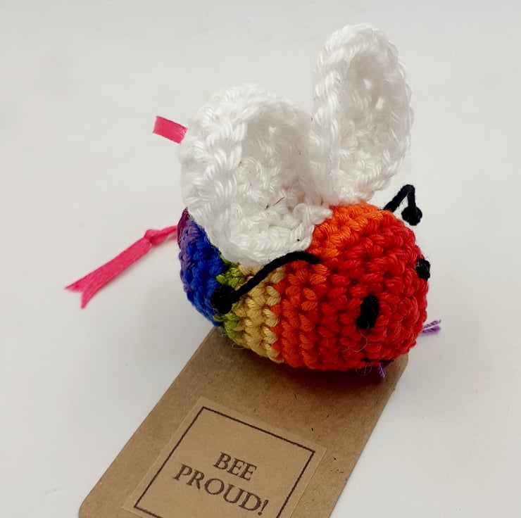 This bright little bee is crocheted in stripes of rainbow coloured cotton. It is filled with polyester stuffing and has a narrow satin ribbon hanging loop. It carries a tag which reads 'Bee Proud!' although I am very happy to exchange this tag for one with wording of your choice.