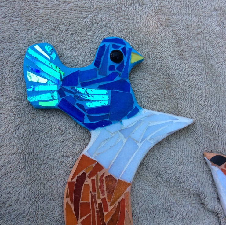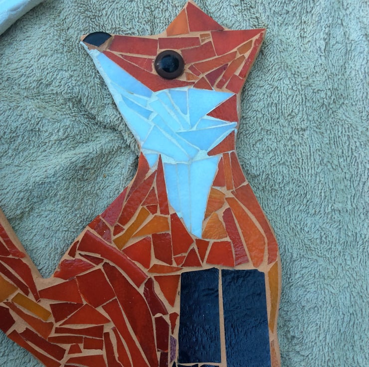 This mosaic is made from stained glass on board it has a hook on the back to display .