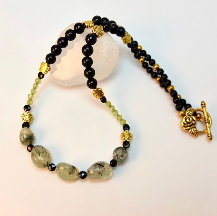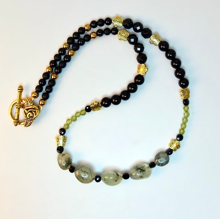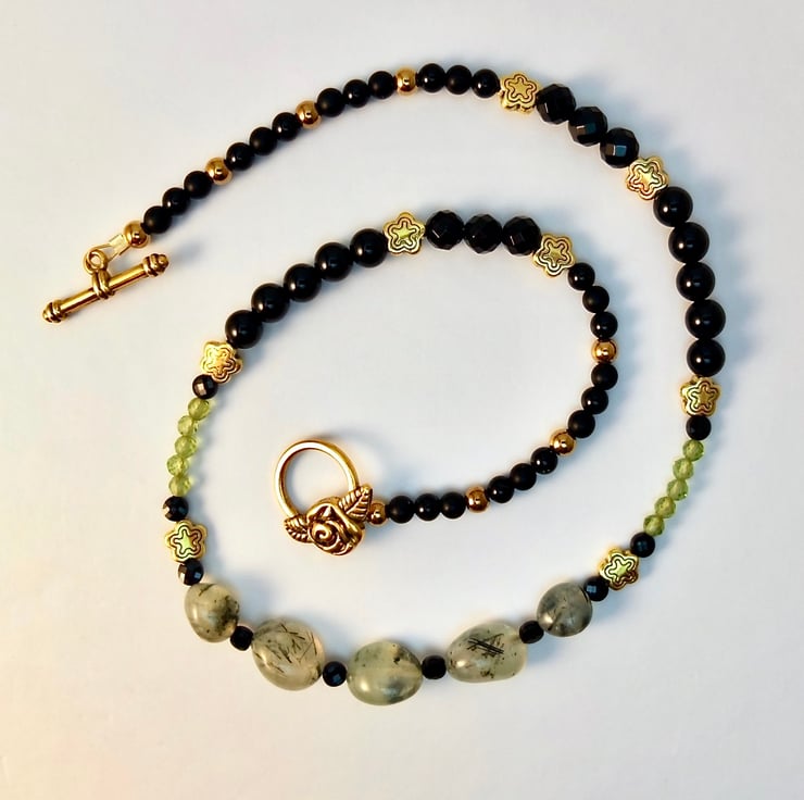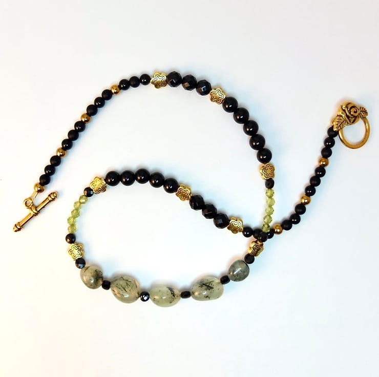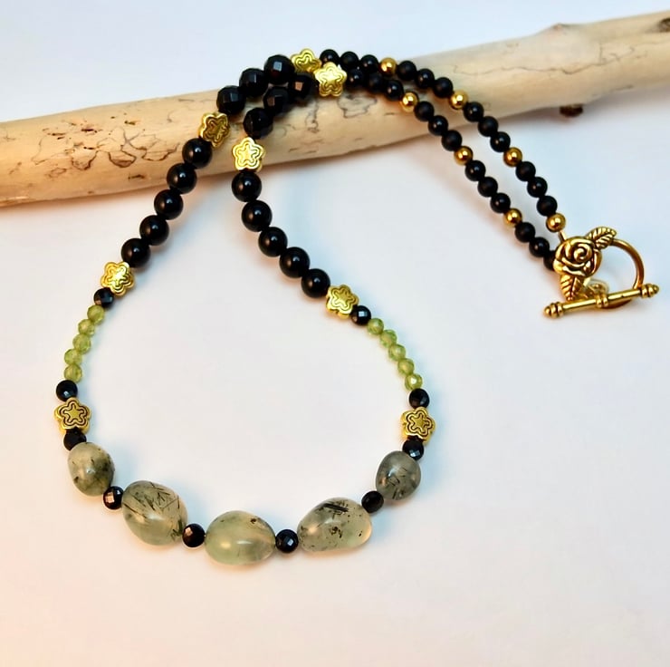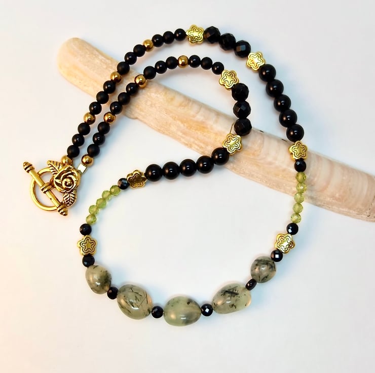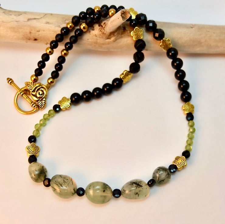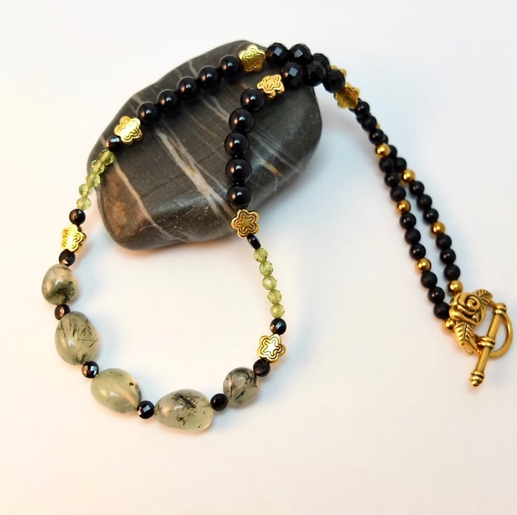 I have used a wide variety of semi-precious beads and gemstone beads to create this pretty and unusual necklace in black, gold and shades of green.