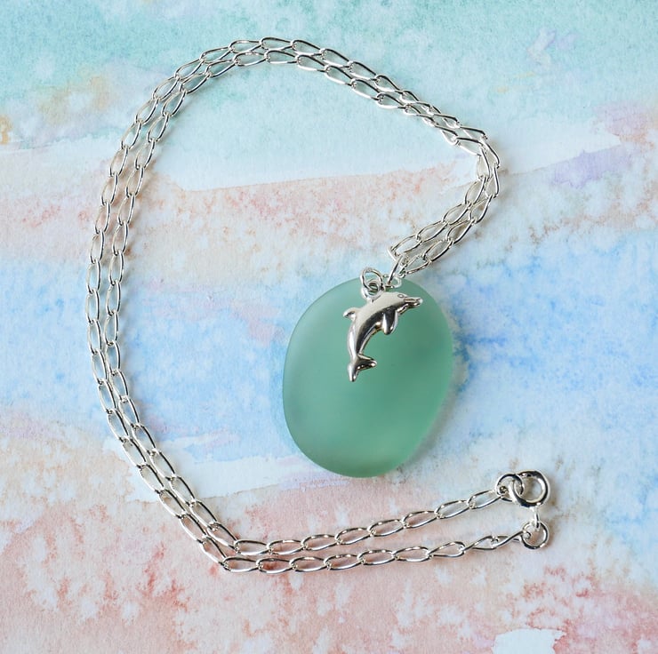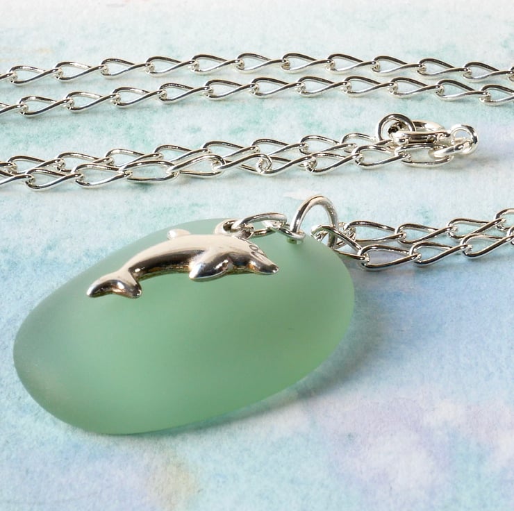 This aqua green seaglass nugget measures approximately 28 x 22 mm and has been collected tumbled & drilled by me, and hung on a sterling silver chain with a sterling silver dolphin charm.
