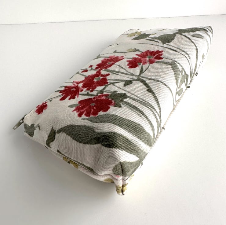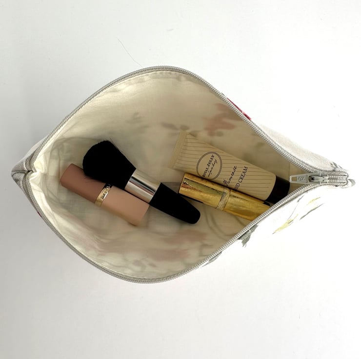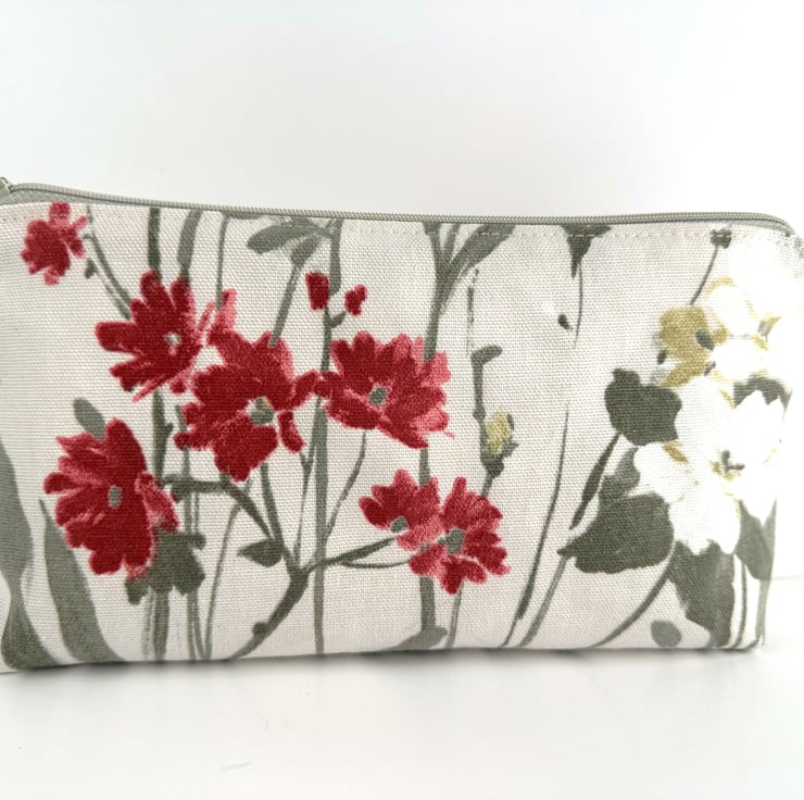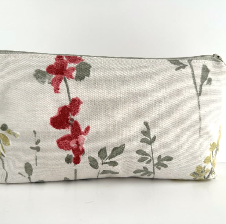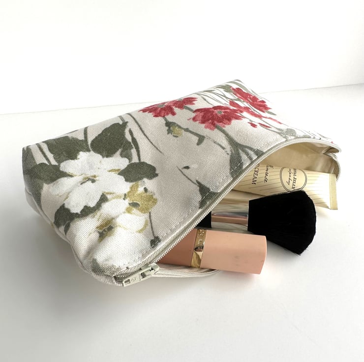 Cottage garden make up bag. This pretty cosmetic bag is made from a lovely cottage garden floral print fabric. The pattern features a variety of flowers in shades of red, white and yellow-green amongst grey-green foliage on a cream background. The make up bag fastens with a pale grey zip and is lined with cream fabric. The base of the bag is boxed to give a spacious interior.