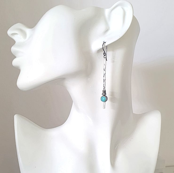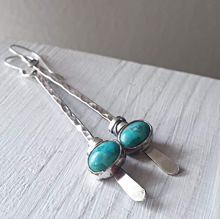 Turquoise earrings made from recycled sterling silver. I've added texture to the silver and treated it to add a dark patina and give an antique, rustic feel. They are slender and light to wear and the colour of the turquoise stands out beautifully.