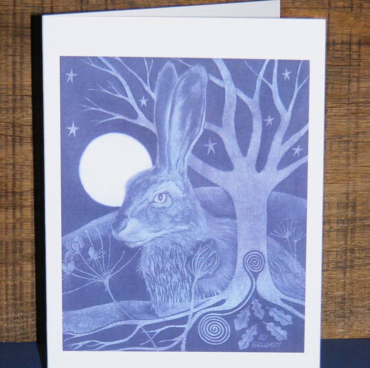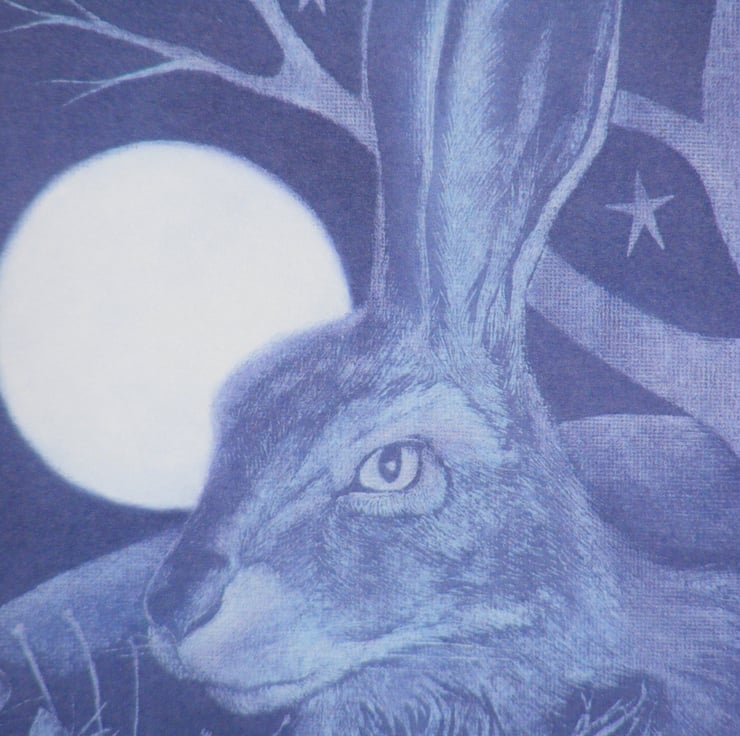 Moonlight Hare is a greeting card which is left blank inside allowing it to be suitable for a number of occasions. The card comes with a cellophane bag and a white envelope and measures 148mm x 210mm and is printed on 350gsm uncoated white card. The image is taken from an original painting of the same name by Ali Broughton.