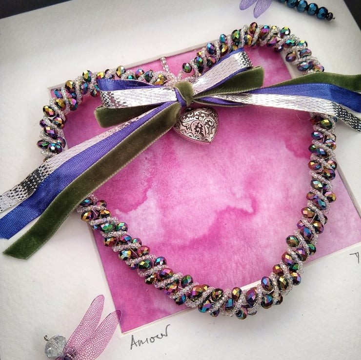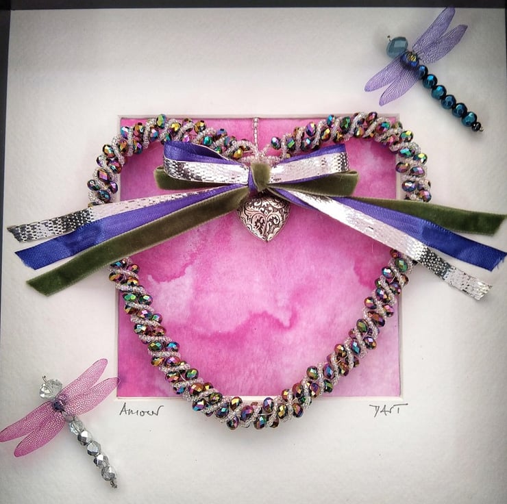 This Dragonfly Love Heart mixed media box frame is all you need to convey your message. I shaped the heart from a pre-loved necklace that I couldn't bear to break apart. It's made up of beautiful fire-polished beads that shine in a whole range of colours. They're interwoven with a coil of tiny seed beads. I finished the piece with recycled ribbons, a metallic heart-shaped pendant and added two mini beaded dragonflies. Its title is simple but speaks volumes - Amour.