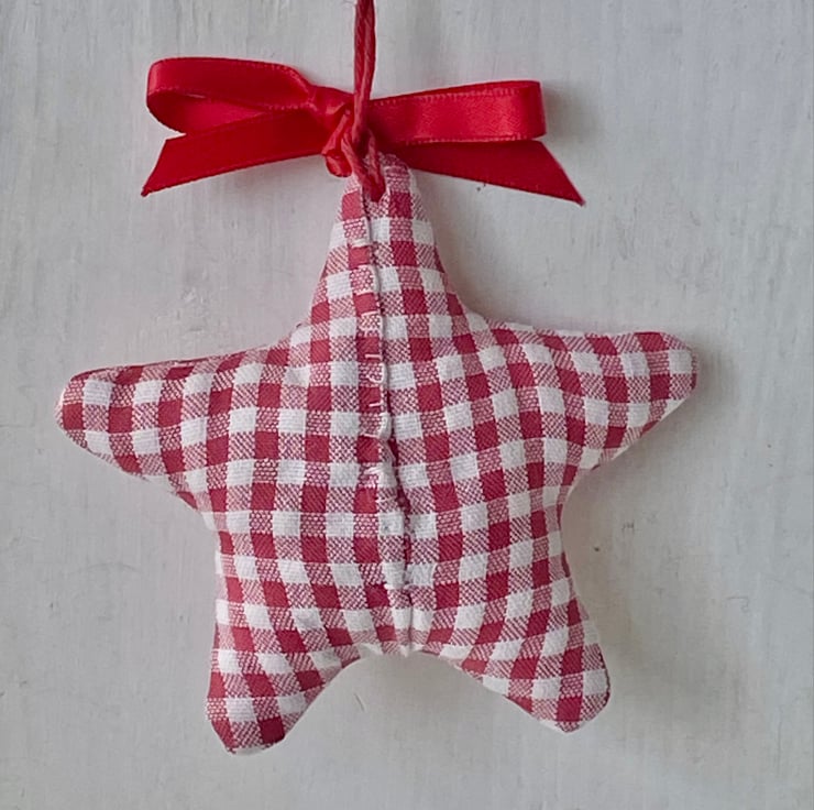 A smart Christmas star decoration in red and white checks, generously padded with toy-grade stuffing and whole cloves for a warm and spicy Christmas aroma. Hand-finished with a red satin ribbon bow, plus red natural hemp twine hanging ties.