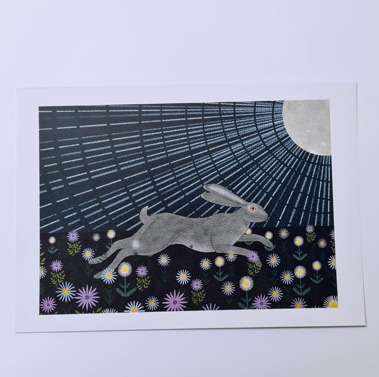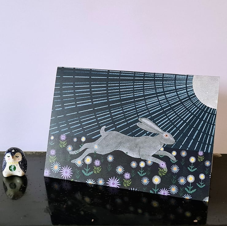 I like hares and enjoy drawing them. I wanted to make a nighttime version of my Hare Running in the Sun image. I like that hares are quite mysterious and liminal creatures, you usually need to be about at dawn or dusk to spot them!
