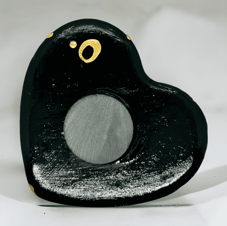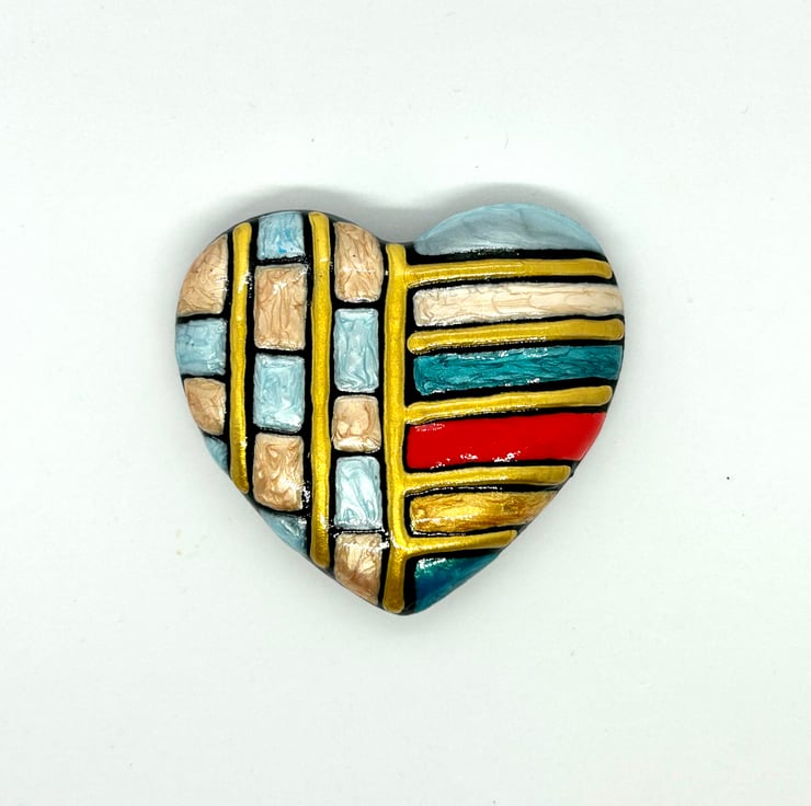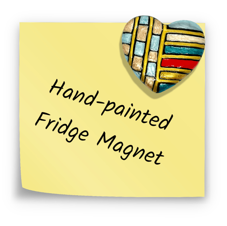 A sweet little heart shaped fridge magnet 5cm x 5cm. Hand cast in plaster and hand-painted in a 2-way striped pattern in pearly shades of teal, red, ice-blue, and champagne gold. Ideal Valentine’s gift or stocking filler.