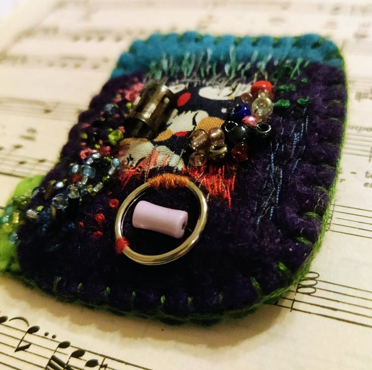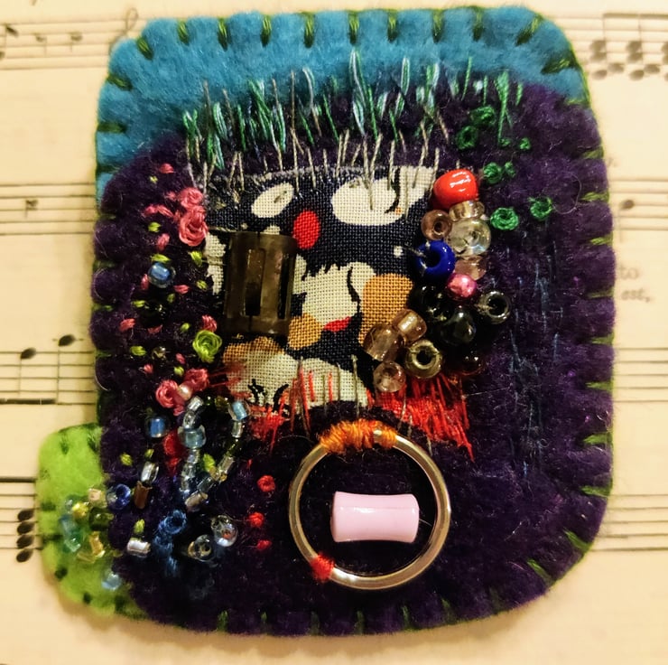 Unique Felt & Hand Embroidered Brooch with seed, bugle beads, sequins, metal ring, printed cotton fabric and embroidery stitch embellishments.