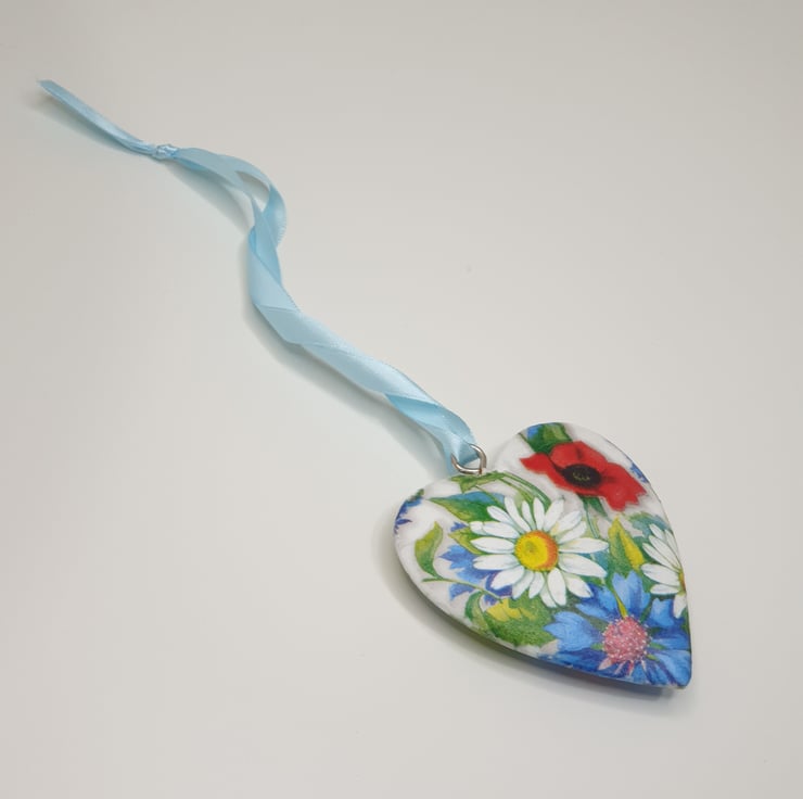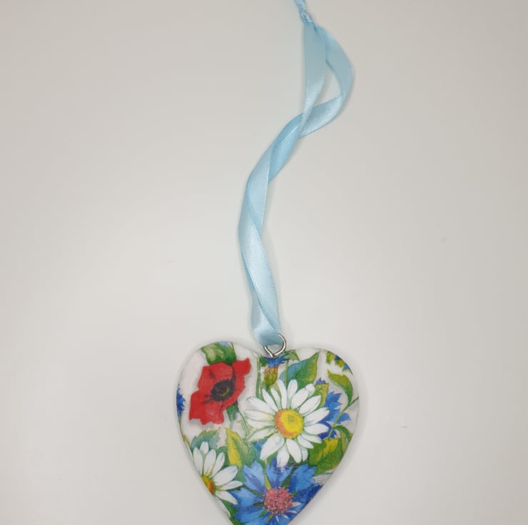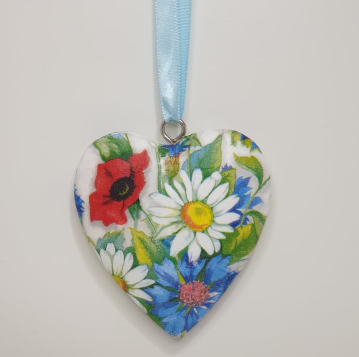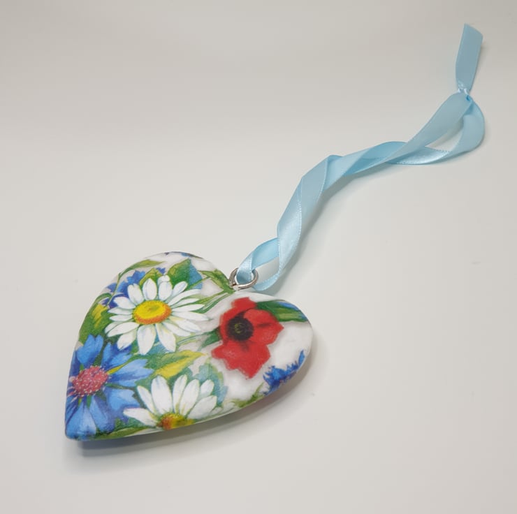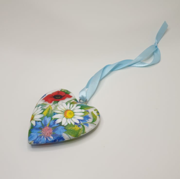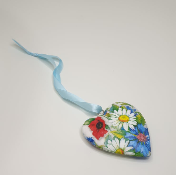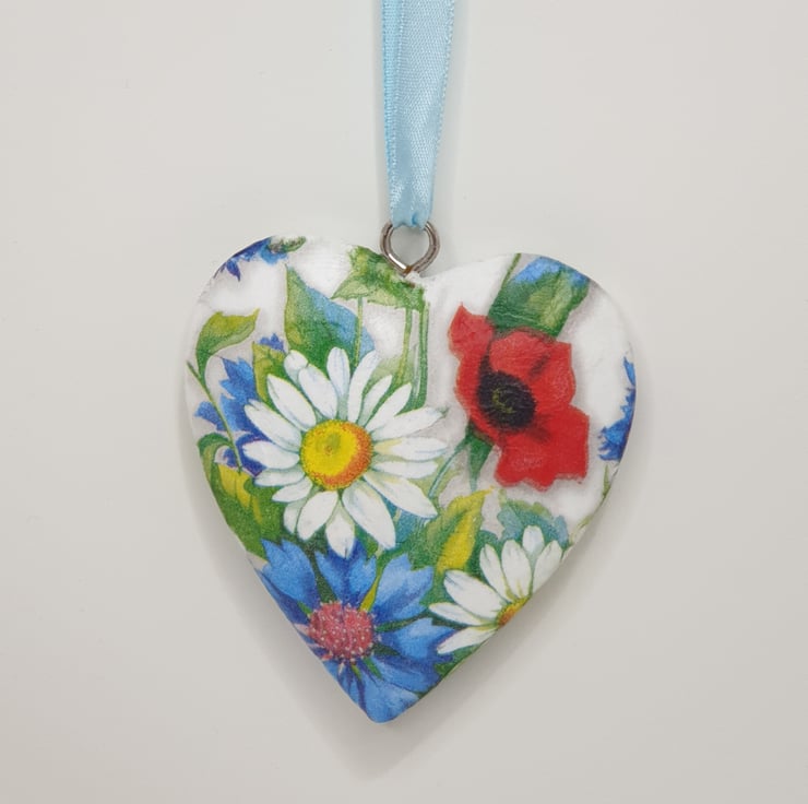 Lovely floral solid heart hanging decoration made of wood which has been painted white and then decoupaged with bright daisies, poppies and cornflowers. The heart has been sealed and finished with pale blue satin ribbon ready to hang. This decorative heart has been decoupaged on both sides so would look perfect hung in a window or from a handle, mantlepiece or piece of furniture.