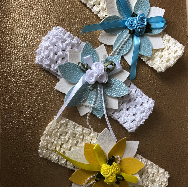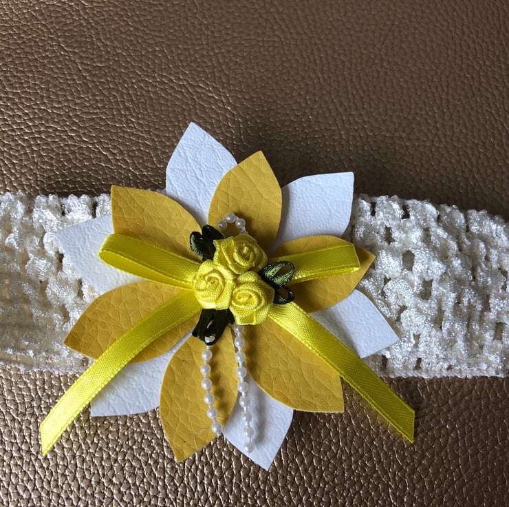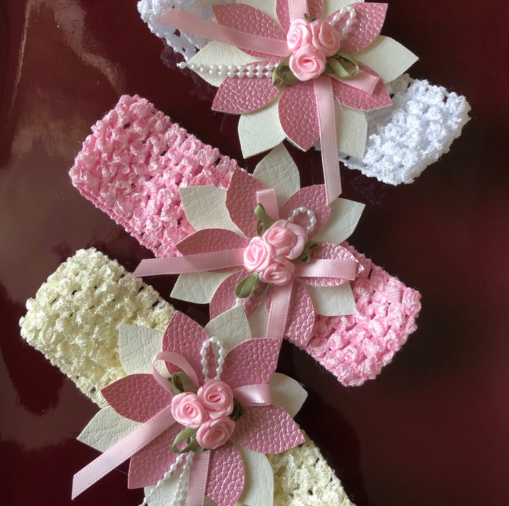 Soft crochet headband with faux leather & satin rose Soft crochet headband with faux leather & satin rose