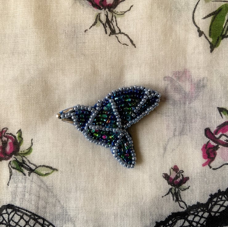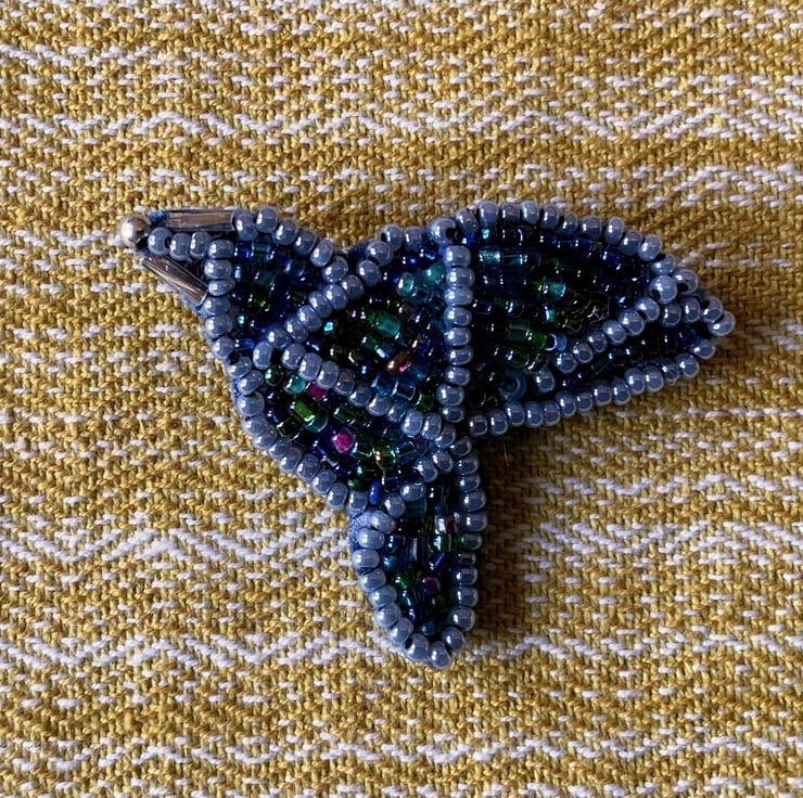 Hand embroidered with mini glass rochelle beads in black,silver. blue and a hint of green and pink.