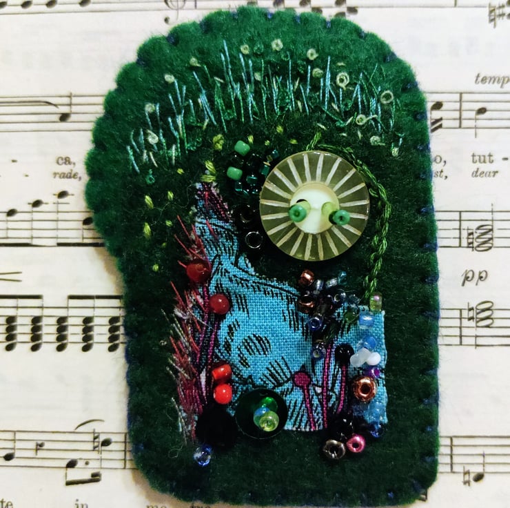 Unique Felt & Hand Embroidered Brooch with seed, bugle beads, sequins, vintage button and embroidery stitch embellishments.