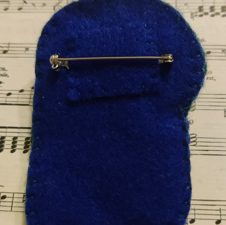 Layers of felt are pieced together and finished with blanket stitch. It has a metal brooch pin on the reverse with a safety catch to keep it secure.