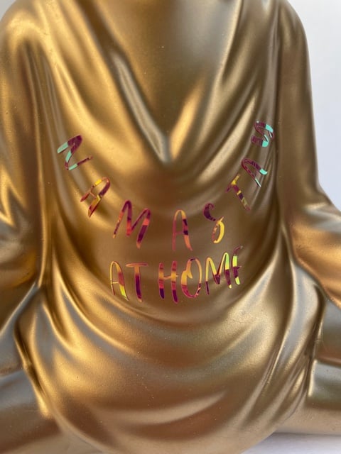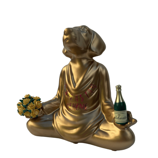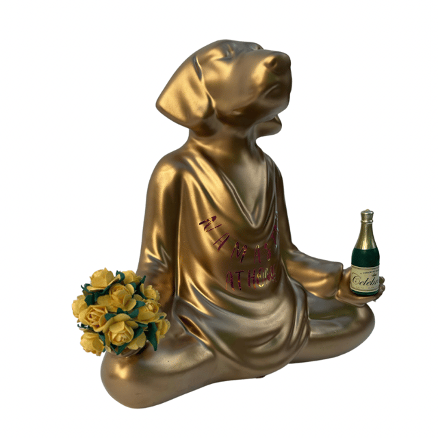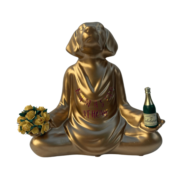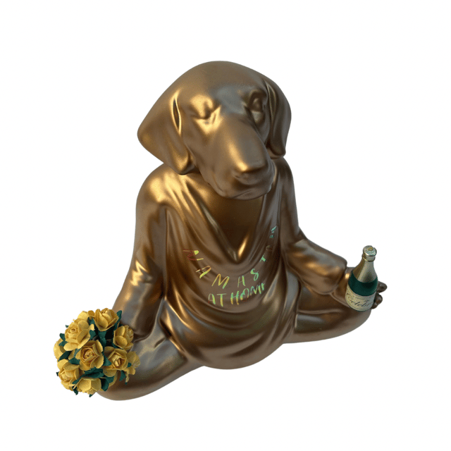 Zen Dog loves nothing more than staying at home, surrounded by pretty flowers, quaffing champagne and chilling out! To re-enforce this point, the t-shirt says “NAMASTAY AT HOME” in hollographic lettering.