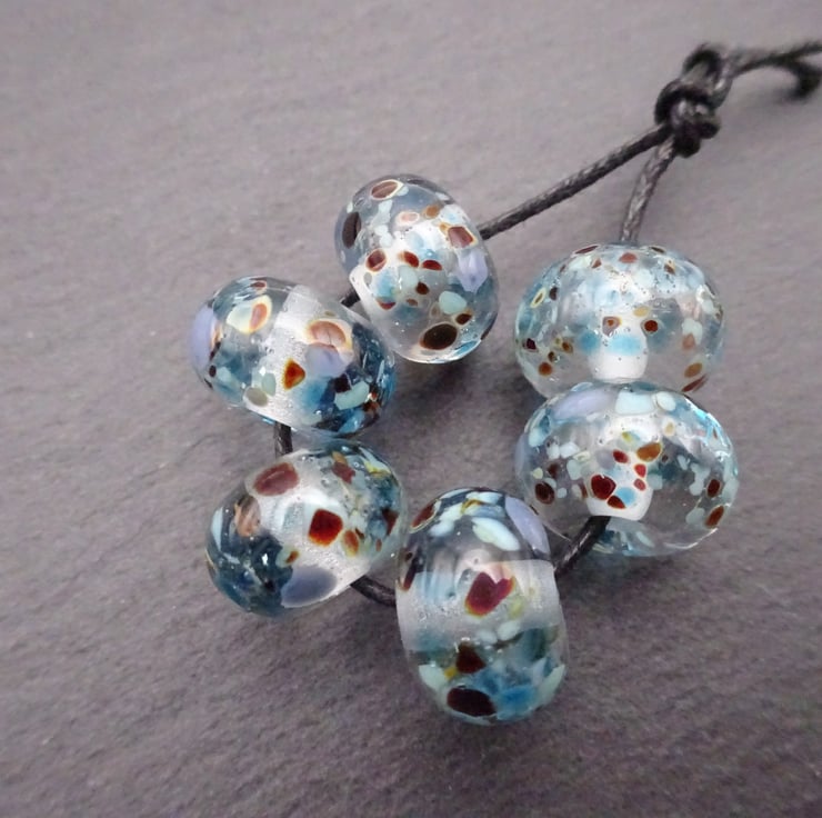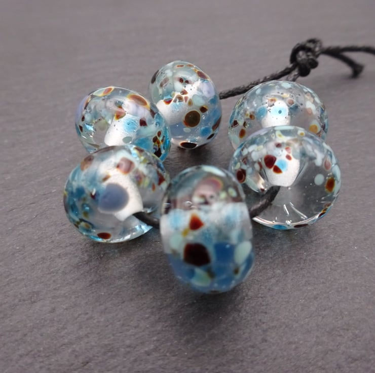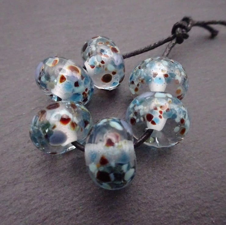 A set of 6 lampwork glass beads made with clear glass and rolled in blue/ brown frit.
