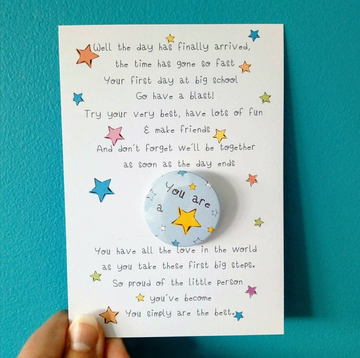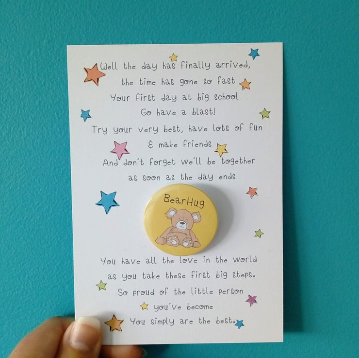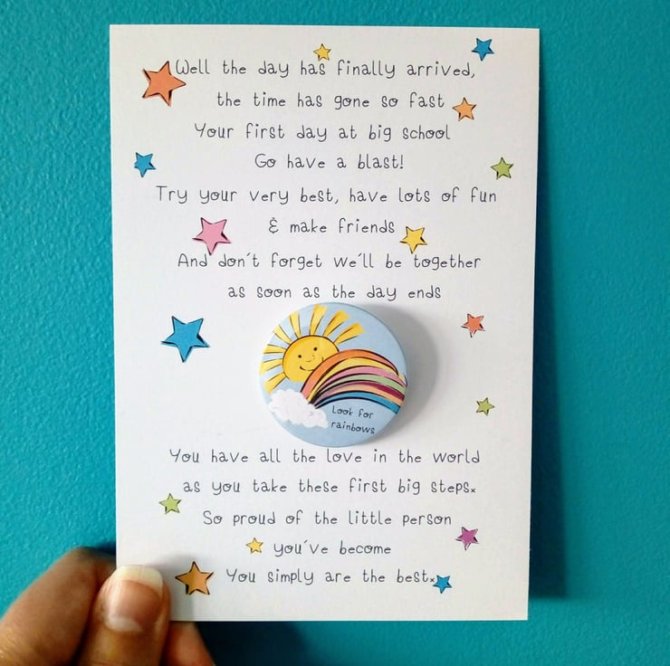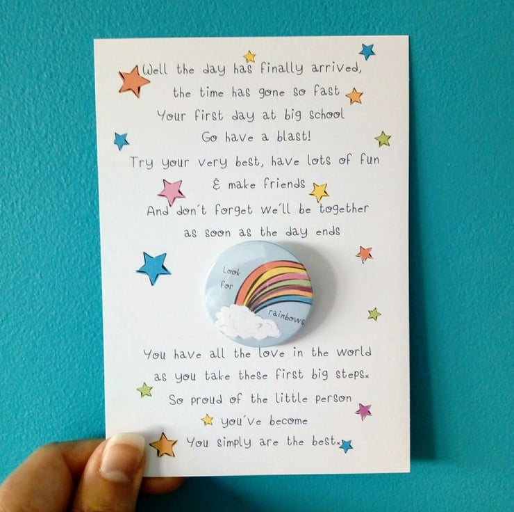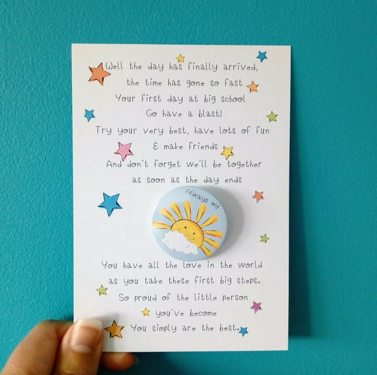 Handcrafted in my studio this cute 38mm badge and accompanying flat card is the perfect little gift to send on that very special day! A wonderful memento of starting school plus a cute badge to wear too. I can also send direct to the recipient, just pop their details in the shipping section when ordering.