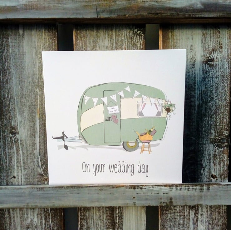 Wedding card, Wedding caravan card, bride and groom, vintage caravan card