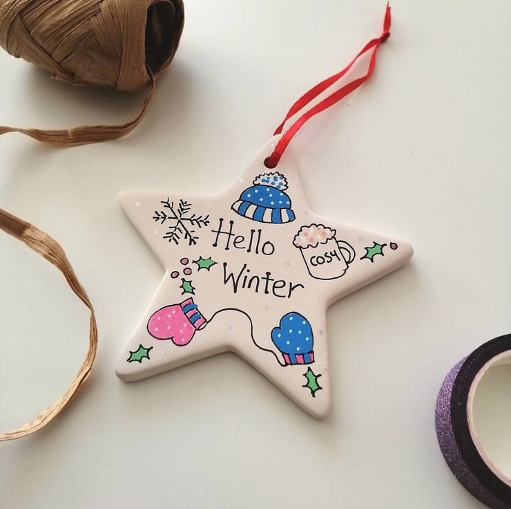 Hello Winter ceramic decoration, star ceramic, Winter decor, winter decoration