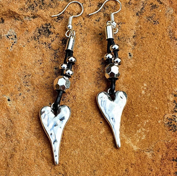 Black leather heart earrings with silver plated ear wires.