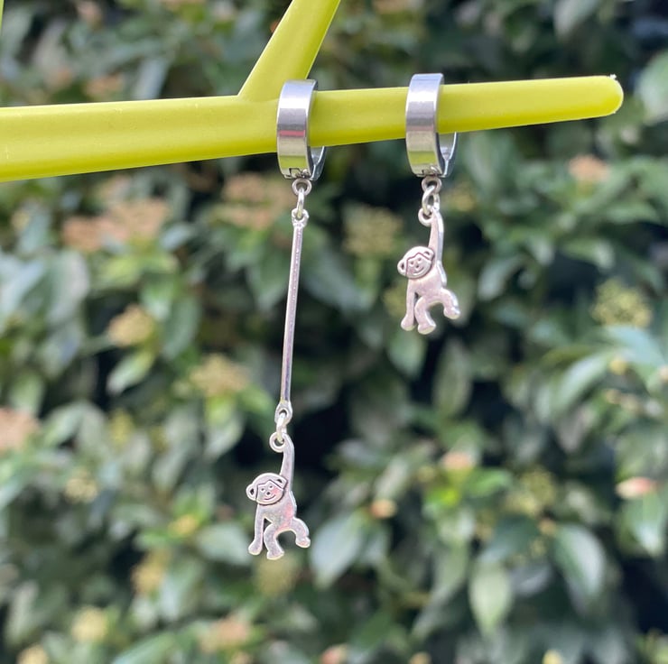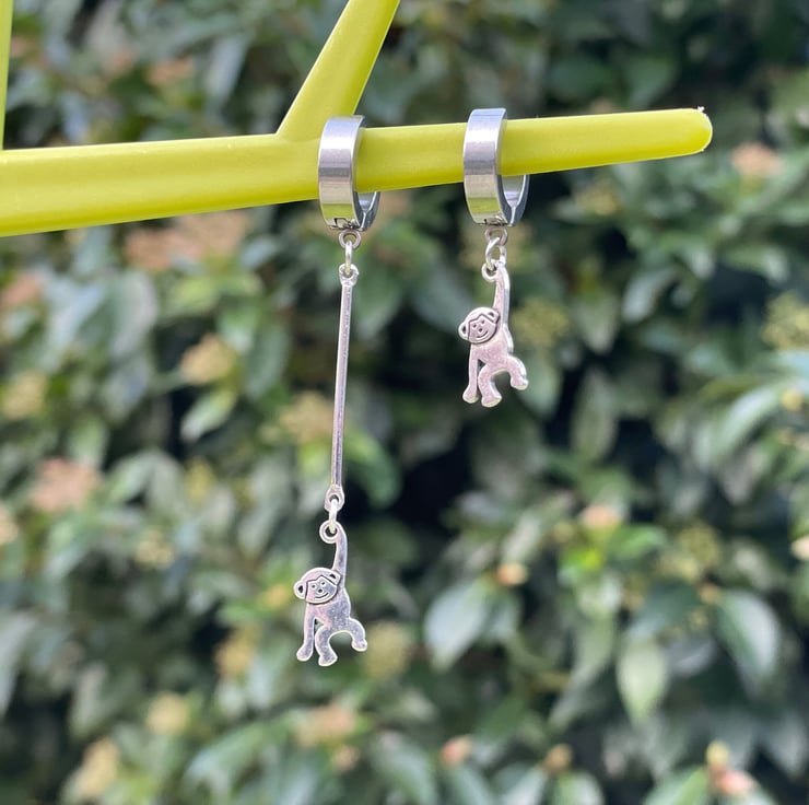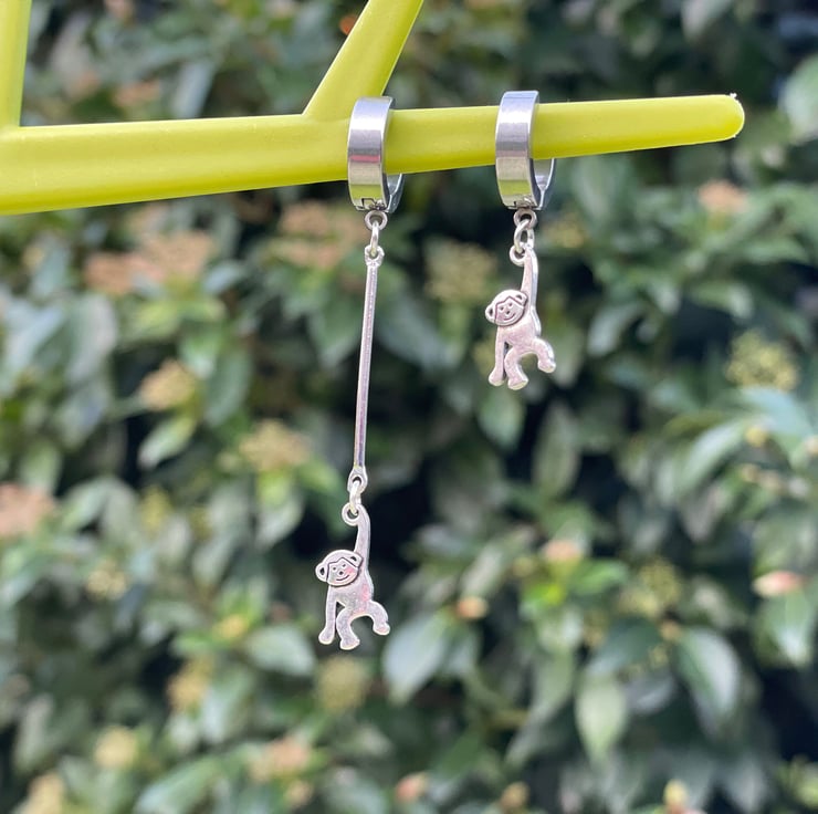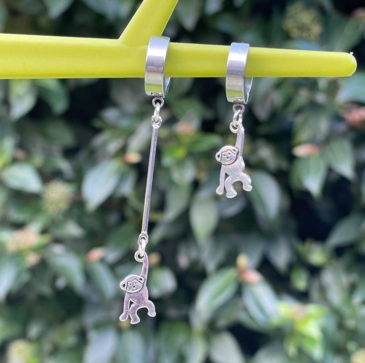 I've used two climbing monkey charms in lovely silver plated brass and paired them with a lovely silver plated long bar connector and stainless steel solid fat huggie hoops for strength.