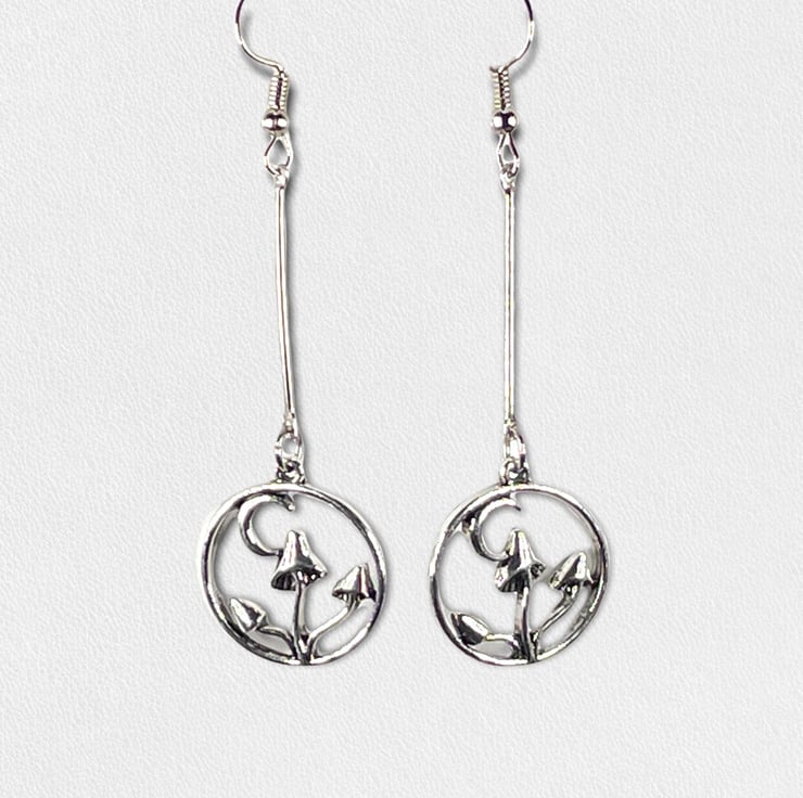 MUSHROOM HOOP EARRINGS drop bar silver plate magic boho goth punk kawaii circle