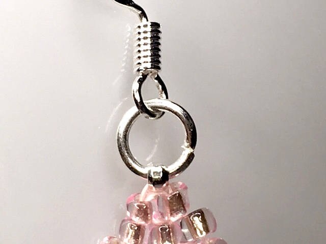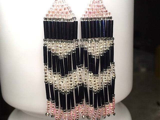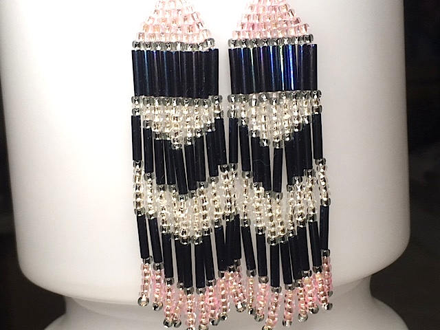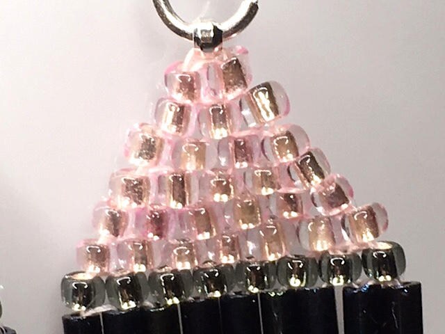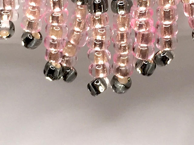 Based on a Native American style but adapted with pearlised pink, clear and dark silver Toho seed beads, elegant and twinkly, they catch fire in the light.