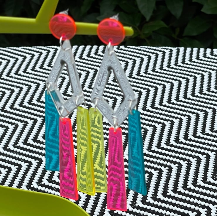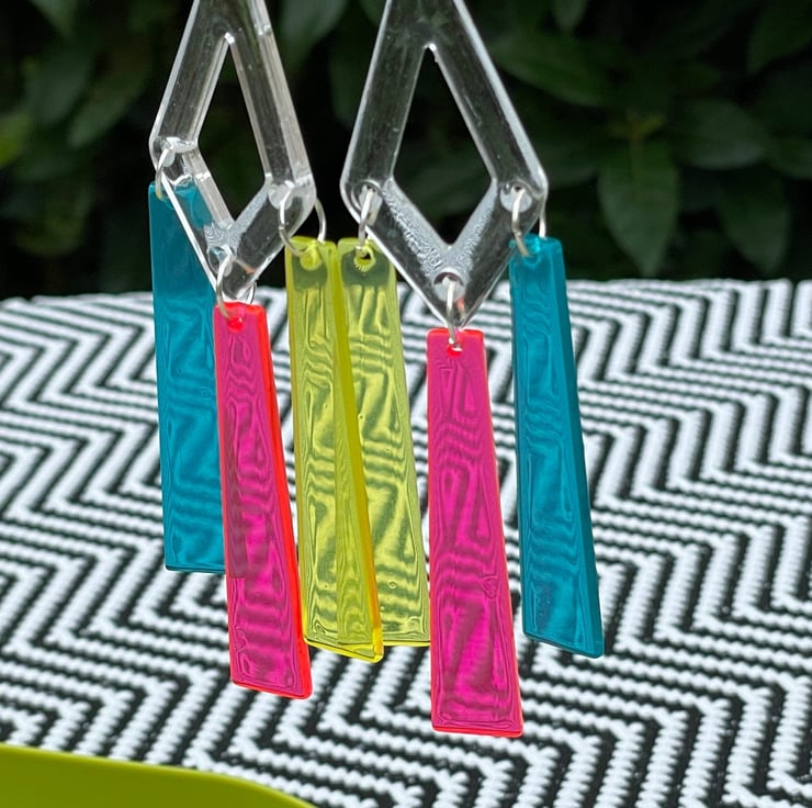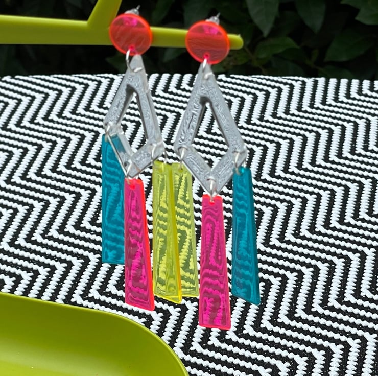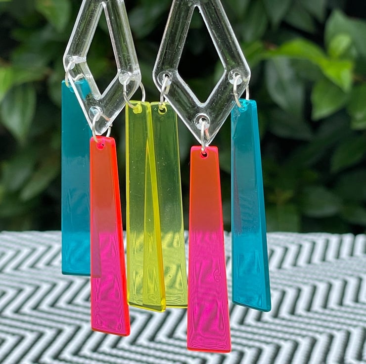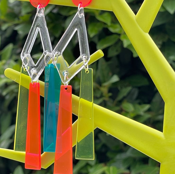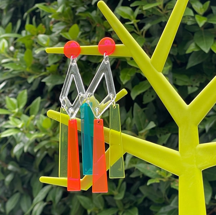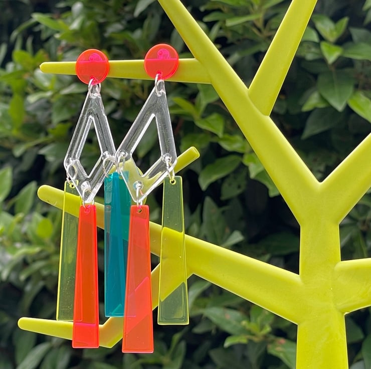I've used clear perspex triangle connector shapes and drilled them then paired them with gorgeous perspex drop shapes in neon pink, blue and yellow. I've finished off with pink perspex neon pushback posts and stainless steel jump rings for extra strength.