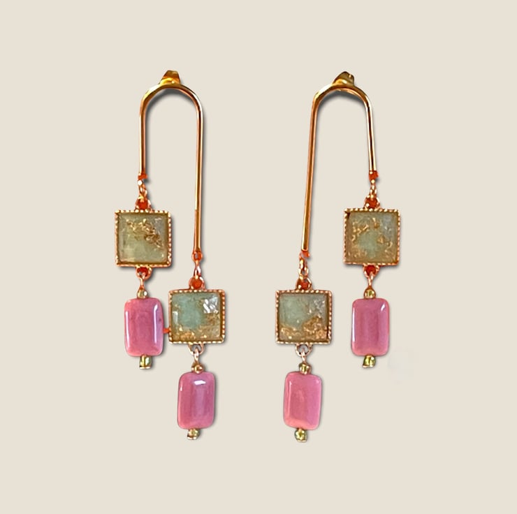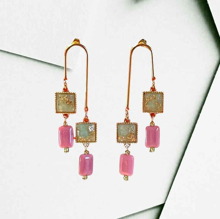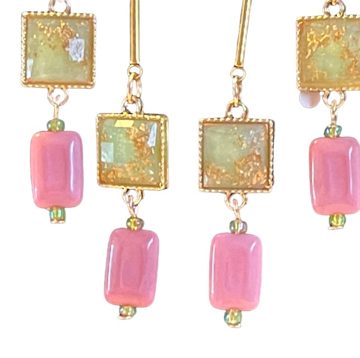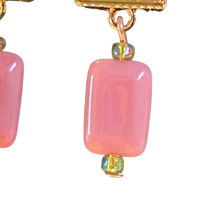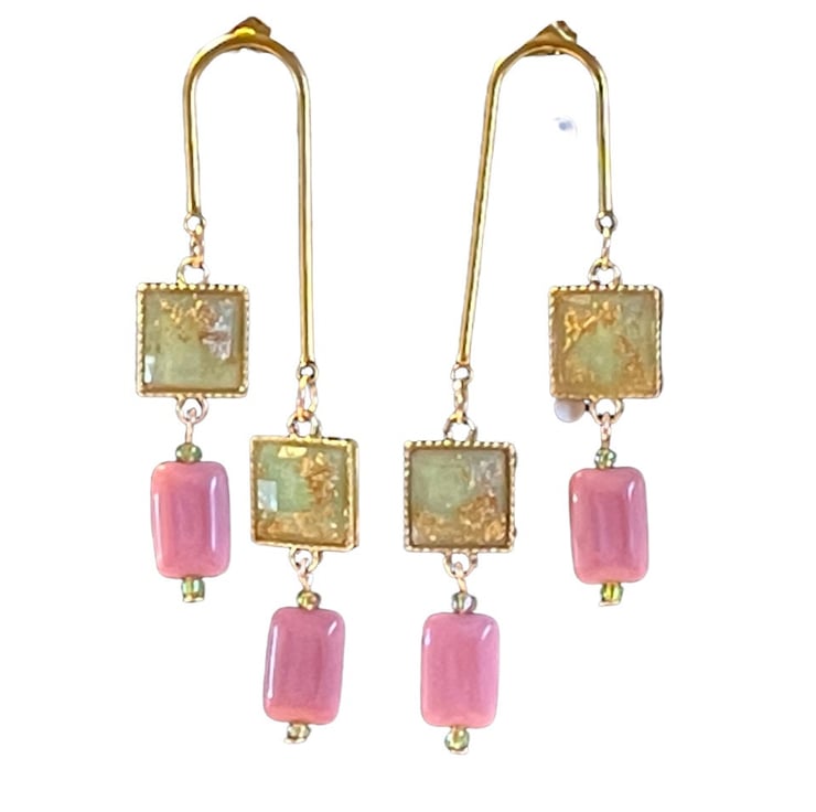 This is such a stunning pair of double drop bar earrings in gold, green and pink. The photos can't do them justice really. They're gorg!