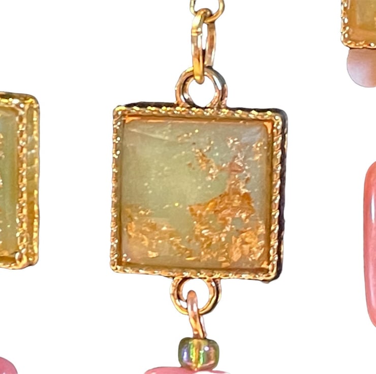 I've had these little vintage pink Czech milk glass beads for a while now and just wanted to do them justice. I've placed them on a double arch asymmetrical bar in gold plated hypo allergenic brass with stunning gold foil mint green resin connectors. I've then finished off with little bright green Japanese Toho seed beads.