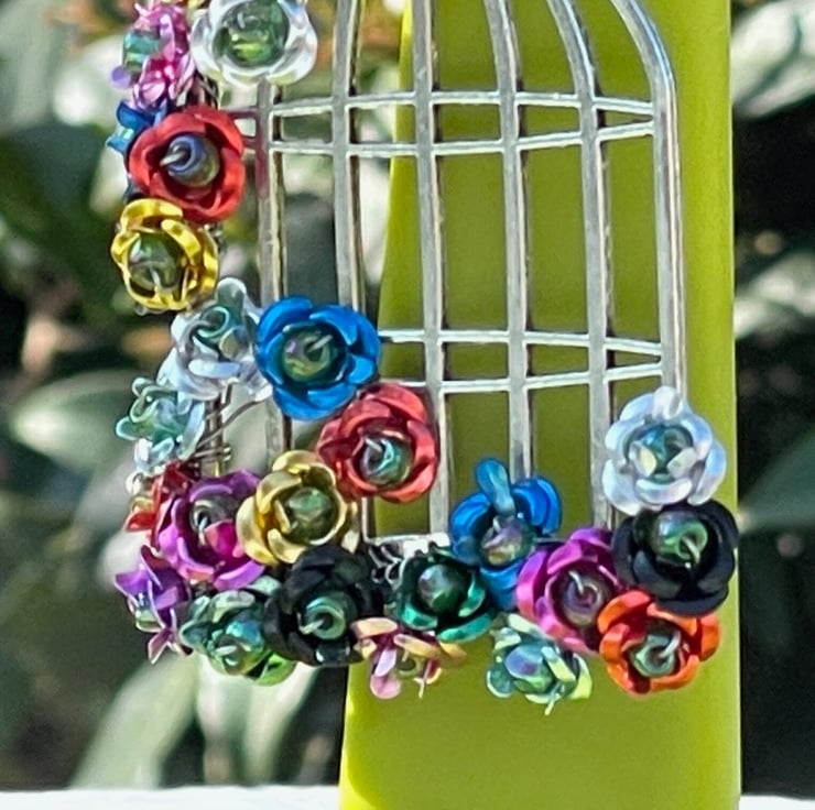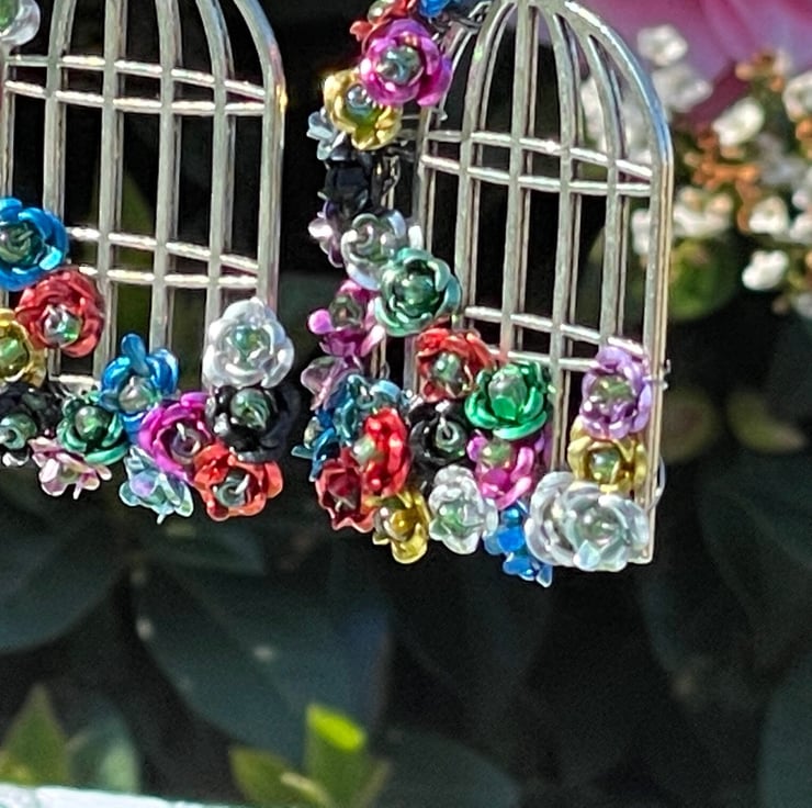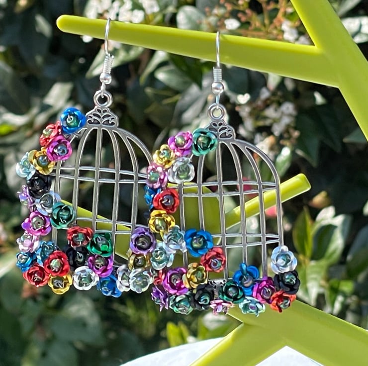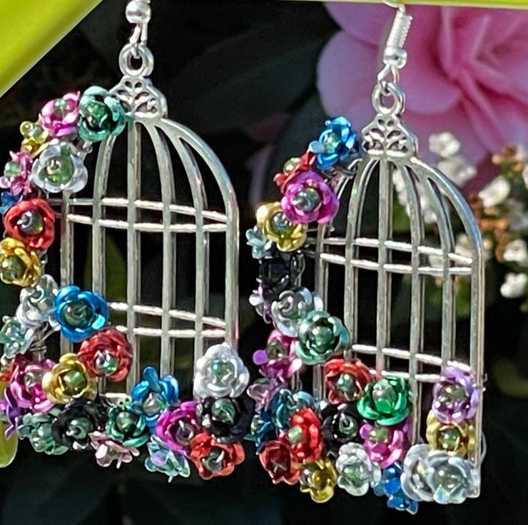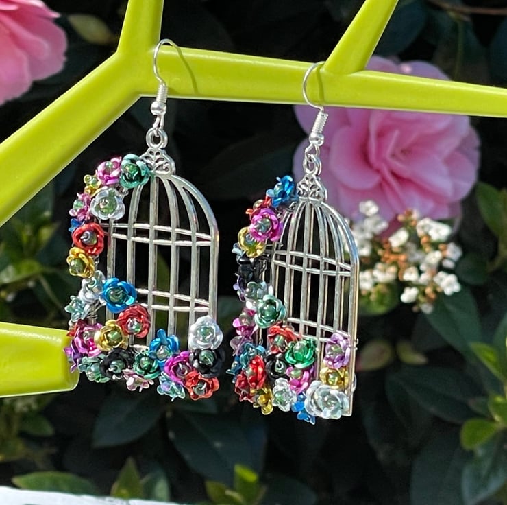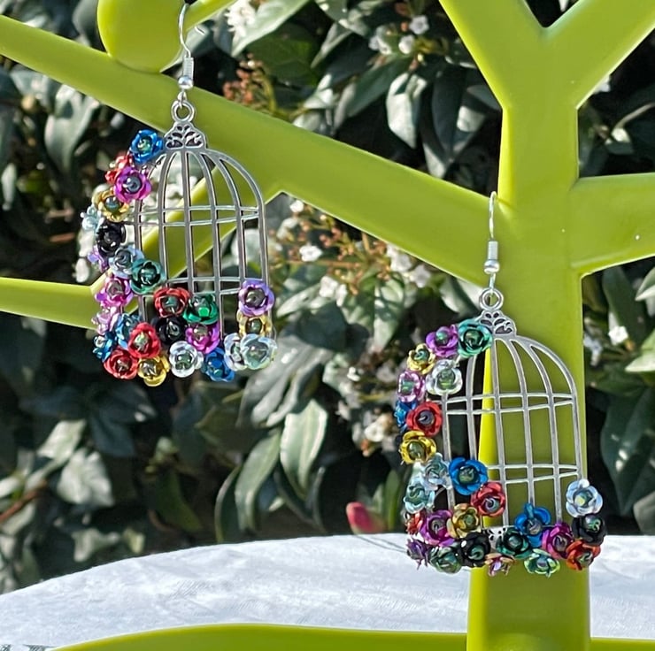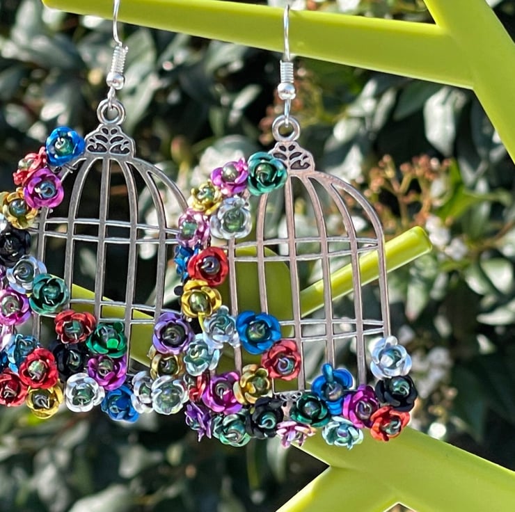 I've used tiny multicoloured metal flowers and wire wrapped them with green Czech glass beads onto beautiful silver plated brass birdcage frames. I've finished off with silver plated hypo allergenic ear wires.