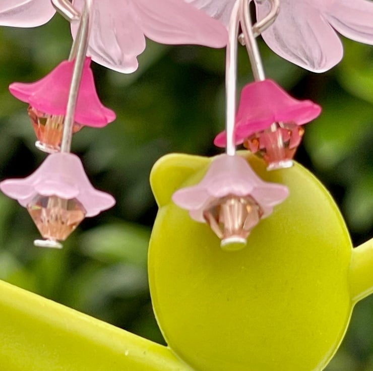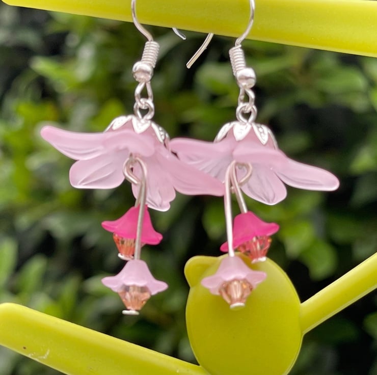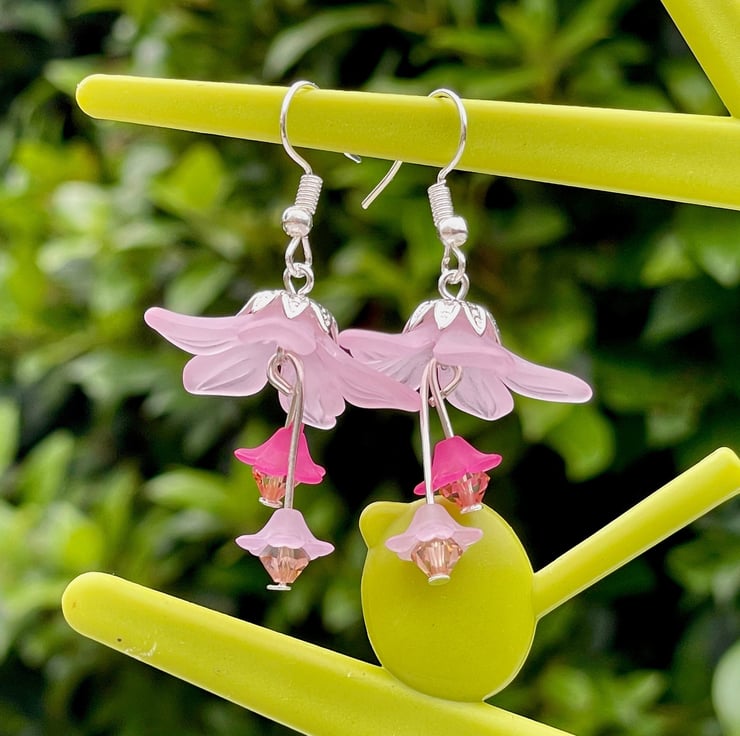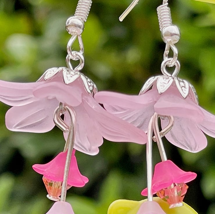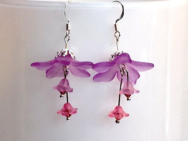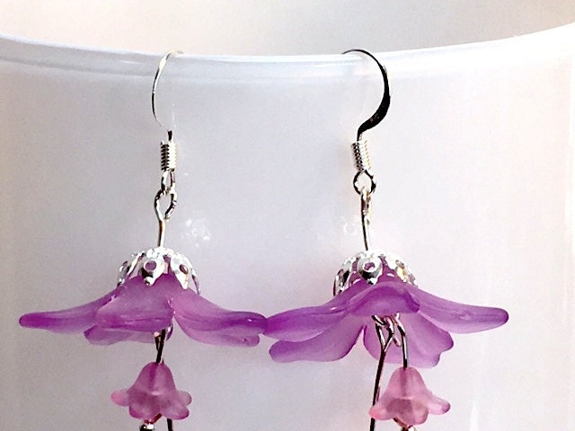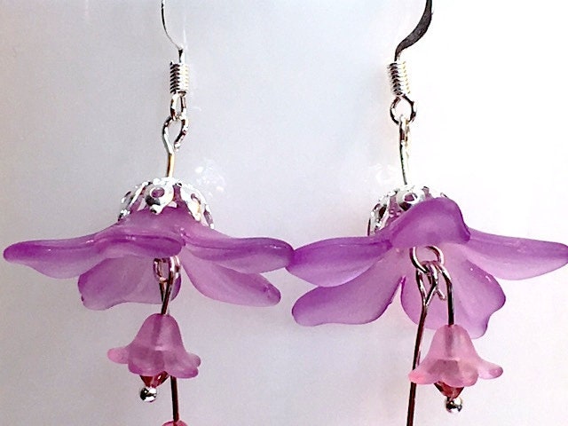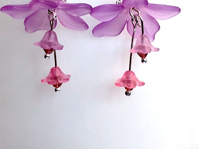Lovely lilac lucite flowers with a silver plated bead cap are adorned with two smaller lucite flowers in a complimentary shade of lilac-pink finished off with tiny crystals for an extra bit of sparkle.